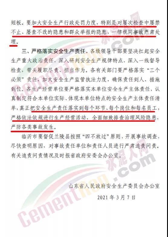 據(jù)水泥人網(wǎng)了解,應(yīng)上述文件要求山東省臨沂市蘭陵縣安委會(huì)已于3月12日開始,通過單位聯(lián)合、聘請專家等方式,按照行業(yè)監(jiān)管、部門主管、鄉(xiāng)鎮(zhèn)(街道)所屬的原則,暗訪抽查所有企業(yè)、所有工地、九小場所、工商貿(mào)企業(yè)、加油站點(diǎn)、涉氨制冷等方面的企業(yè)安全生產(chǎn)隱患排查、員工培訓(xùn)、應(yīng)知應(yīng)會(huì)、應(yīng)急預(yù)案、應(yīng)急演練等工作。