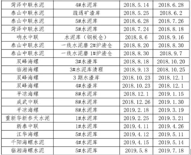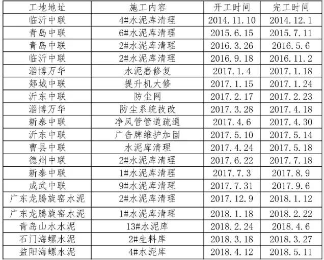 從首次清庫至今,鑫盛利共清理幾百個儲存庫,針對不同區(qū)域、氣候、庫型、施工現(xiàn)場工況作出相應(yīng)的方案,并且做到一庫一檔方便后期維護及再次清理時查閱。現(xiàn)已進入成熟的清庫階段,并穩(wěn)步發(fā)展,與中聯(lián)、海螺、山水、沂州等水泥企業(yè)達成了戰(zhàn)略合作,為水泥企業(yè)的安全高效清庫提供了保障。