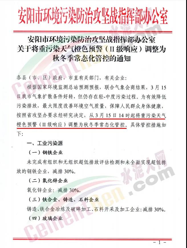 安陽市環(huán)境污染防治攻堅(jiān)戰(zhàn)指揮部辦公室發(fā)布《關(guān)于將重污染天氣橙色預(yù)警(II級響應(yīng))調(diào)整為秋冬季常態(tài)化管控的通知》稱,按照河南省攻堅(jiān)辦要求經(jīng)研究決定,從3月15日14時起將重污染天氣 橙色預(yù)警(II級響應(yīng))調(diào)整為秋冬季常態(tài)化管控。