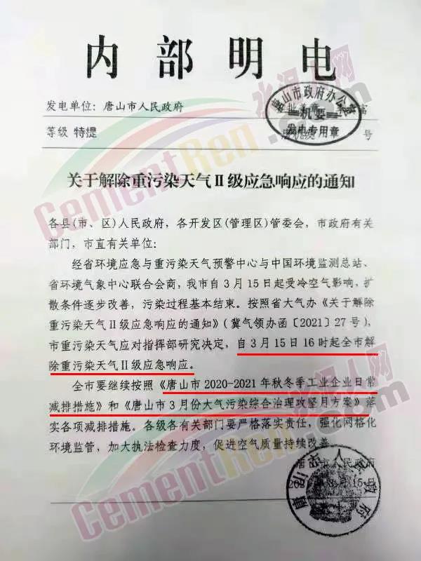 唐山市人民政府發(fā)布特提內(nèi)部明電《關(guān)于解除重污染天氣II級應(yīng)急響應(yīng)的通知》要求自3 月15日16 時起全市解除重污染天氣ⅡI級應(yīng)急響應(yīng)。唐山全市要繼續(xù)按照《唐山市 2020-2021年秋冬季工業(yè)企業(yè)日常減排措施》和《唐山市3 月份大氣污染綜合治理攻堅(jiān)月方案》落實(shí)各項(xiàng)減排措施。各級各有關(guān)部門要嚴(yán)格落實(shí)責(zé)任,強(qiáng)化網(wǎng)格化環(huán)境監(jiān)管,加大執(zhí)法檢查力度,促進(jìn)空氣質(zhì)量持續(xù)改善。