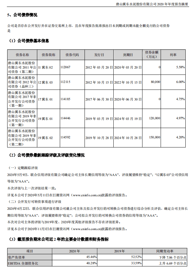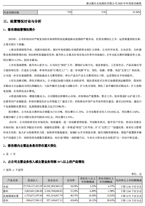 2020 年度,面對新冠肺炎疫情及水泥、熟料價格下降帶來的不利影響,公司積極主動作為,進一步提升管理效能,積極推進生產(chǎn)企業(yè)“培優(yōu)”,運營質(zhì)量持續(xù)提升;持續(xù)加強成本及費用管控,單位產(chǎn)品生產(chǎn)成本及費用同比下降;強化戰(zhàn)略營銷的實施,市場基礎(chǔ)進一步夯實,結(jié)構(gòu)進一步優(yōu)化,水泥、熟料銷量同比提升。公司歸屬于上市公司股東的凈利潤同比上升。