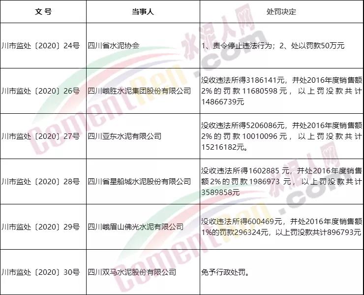 3月16日,四川省市場監(jiān)督管理局發(fā)布6條《行政處罰決定書》。其中針對于當(dāng)?shù)?a href="http://www.gzhcccc.com/news/list_1.html" target="_blank" class="keylink">水泥行業(yè)的處罰決定書提到案件來源及調(diào)查經(jīng)過為:2017年7月,四川省發(fā)展和改革委員會從多個途徑收到反映四川省水泥協(xié)會組織本行業(yè)經(jīng)營者聯(lián)合漲價的舉報。經(jīng)初步核查后,四川省發(fā)展和改革委員會于2017年7月20日正式對四川省水泥協(xié)會及涉嫌達(dá)成并實(shí)施壟斷協(xié)議 的六家水泥經(jīng)營者予以立案調(diào)查。