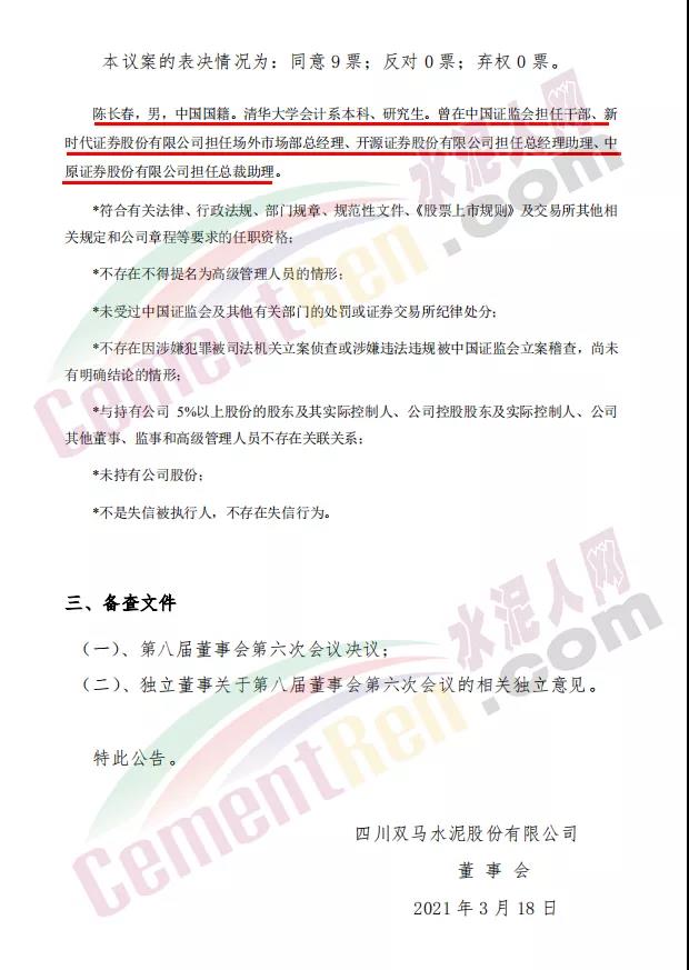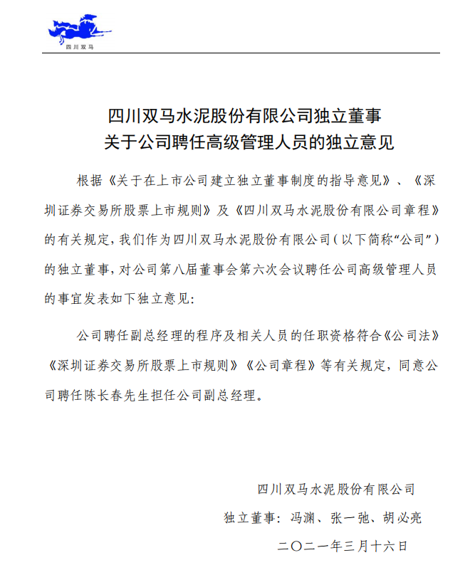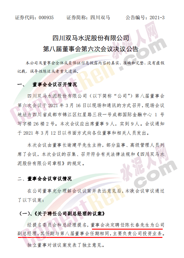 日前,四川雙馬(000935)發(fā)布公告稱,經(jīng)第八屆董事會第六次會議審議通過,決定聘任陳長春為公司副總經(jīng)理,主要負責公司投資業(yè)務。