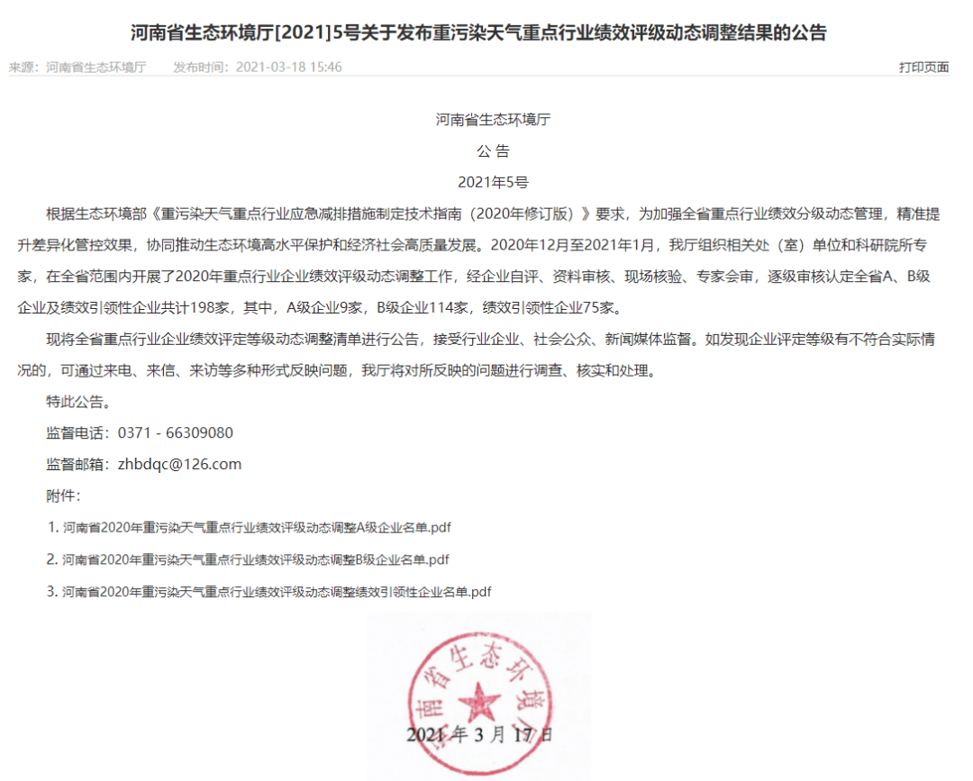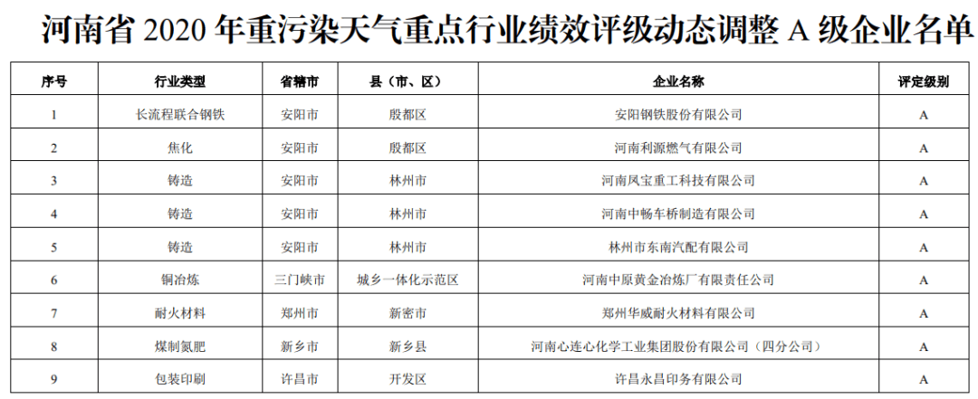 日前,河南省生態(tài)環(huán)境廳發(fā)布重污染天氣重點行業(yè)績效評級動態(tài)調(diào)整結(jié)果的公告稱,2020年12月至2021年1月,河南省生礦環(huán)境廳組織相關(guān)處(室)單位和科研院所專家,在全省范圍內(nèi)開展了2020年重點行業(yè)企業(yè)績效評級動態(tài)調(diào)整工作,經(jīng)企業(yè)自評、資料審核、現(xiàn)場核驗、專家會審,逐級審核認定全省A、B級企業(yè)及績效引領(lǐng)性企業(yè)共計198家,其中,A級企業(yè)9家,B級企業(yè)114家,績效引領(lǐng)性企業(yè)75家。