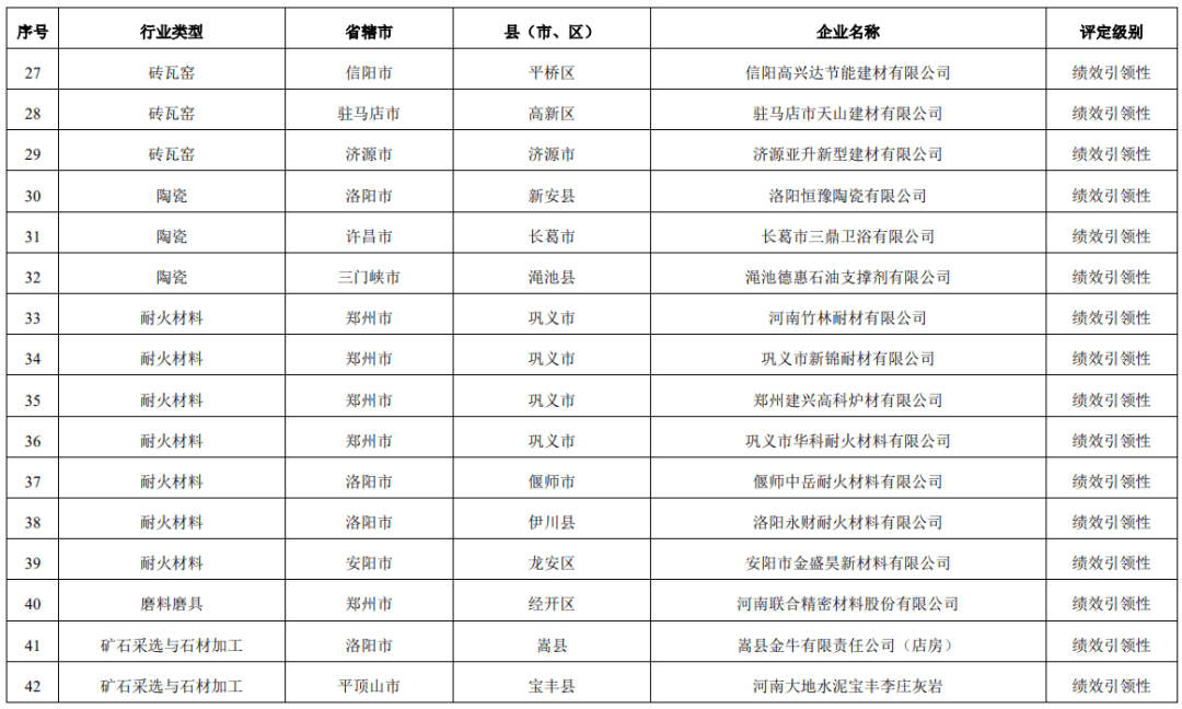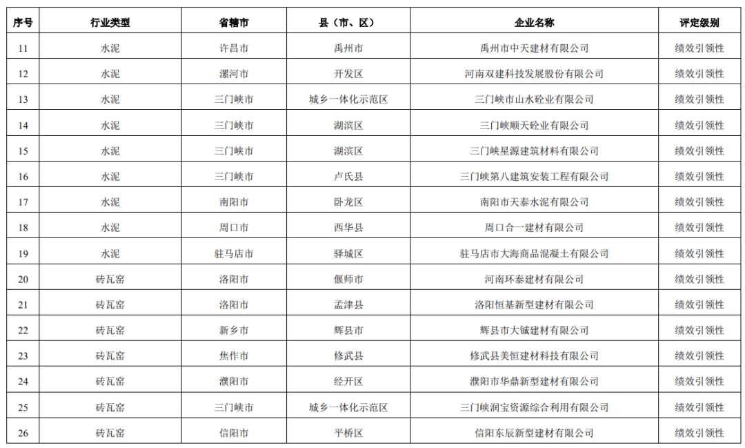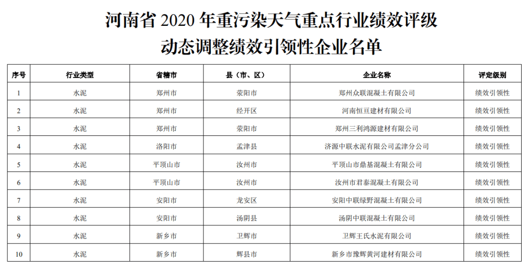 其中水泥行業(yè)郟縣中聯(lián)天廣水泥有限公司、湖波集團安陽市新天河水泥有限責(zé)任公司、禹州市錦信水泥有限公司三家企業(yè)獲評B級;安陽中聯(lián)綠野混凝土有限公司、湯陰中聯(lián)混凝土有限公司、衛(wèi)輝王氏水泥有限公司等19家企業(yè)獲評績效引性型企業(yè)。