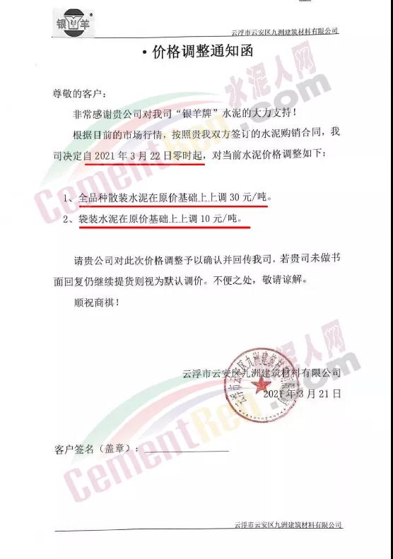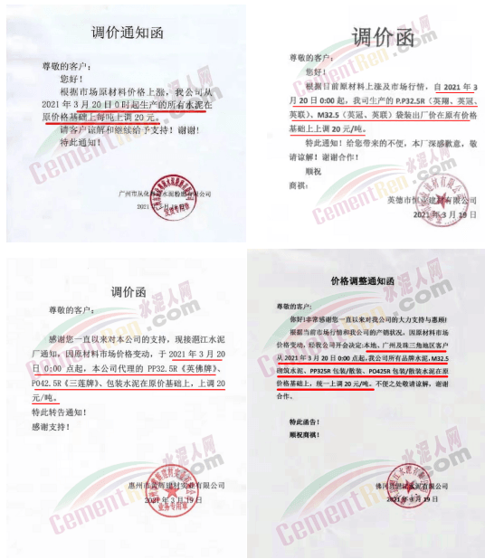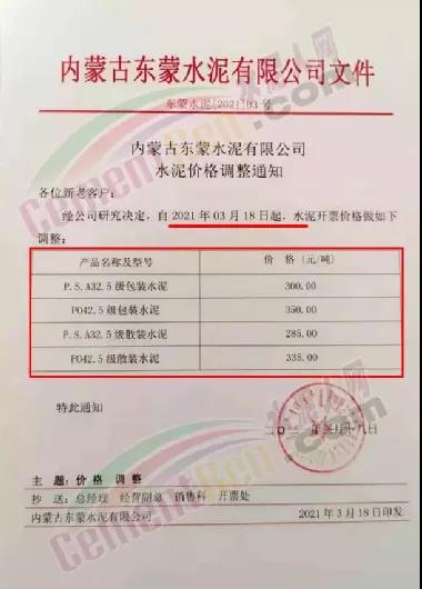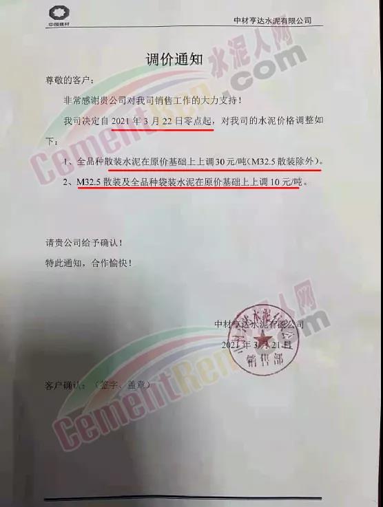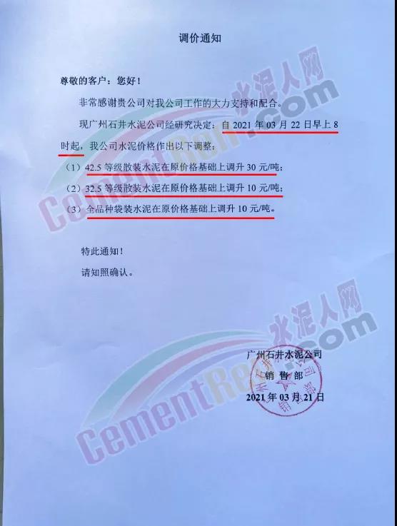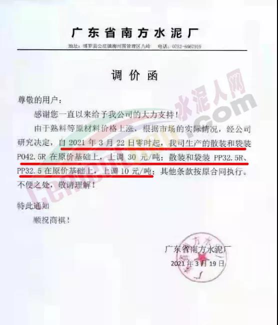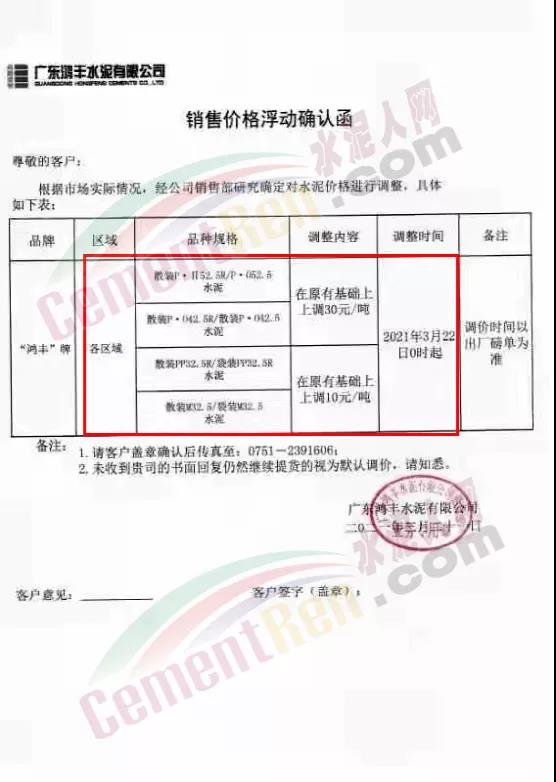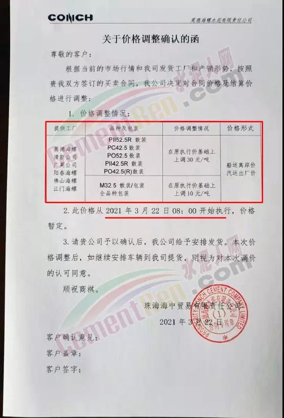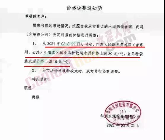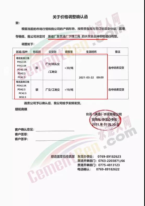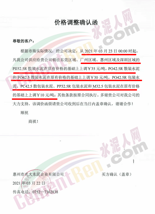 惠州市光大水泥通知,根據(jù)市場(chǎng)實(shí)際情況,經(jīng)公司決定,從2021年03月23日零時(shí)起,公司銷(xiāo)往東莞區(qū)域、廣州區(qū)域、惠州區(qū)域及深圳區(qū)域的 PII52.5R散裝水泥在原有價(jià)格的基礎(chǔ)上上調(diào)35元/噸,PO42.5R散裝水泥和PO42.5散裝水泥在原有價(jià)格的基礎(chǔ)上上調(diào)30元/噸,PO42.5R包裝水泥、PC42.5 散包裝水泥、PP32.5R包裝水泥和M32.5包裝水泥在原有價(jià)格的基礎(chǔ)上上調(diào)10元/噸;其他條款按原合同執(zhí)行。