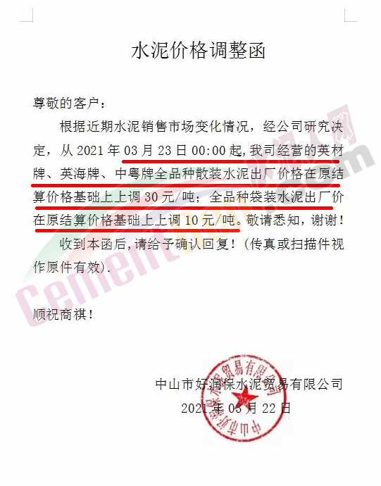 中山市好潤(rùn)保水泥貿(mào)易有限公司通知,從2021年03月23日零時(shí)起,公司經(jīng)營(yíng)的英材牌、英海牌、中粵牌全品種散裝水泥出廠(chǎng)價(jià)格在原結(jié)算價(jià)格基礎(chǔ)上上調(diào) 30元/噸;全品種袋裝水泥出廠(chǎng)價(jià)在原結(jié)算價(jià)格基礎(chǔ)上上調(diào) 10元/噸。