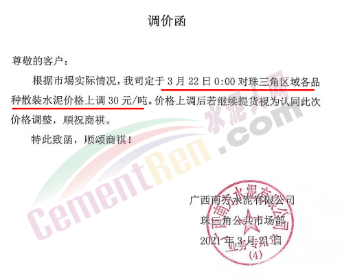 廣西南方通知自3月22日起對(duì)珠三角區(qū)域各品種散裝水泥上調(diào)30元/噸。