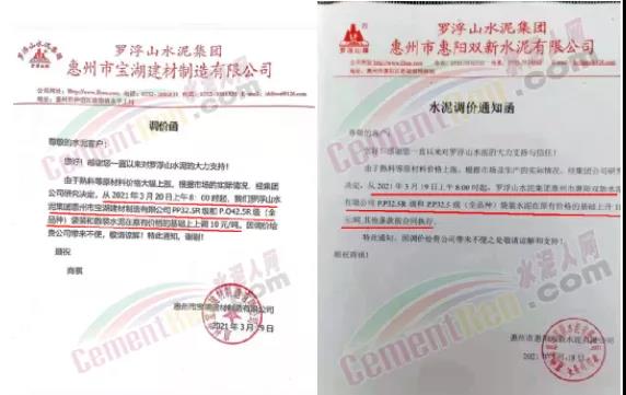 羅浮山水泥集團(tuán)惠州市寶湖建材水泥通知3月20日起PO42.5級(jí)水泥上調(diào)10元/噸?;蓐?yáng)雙新水泥通知3月19日起上調(diào)P.P32.5R級(jí)和P.P32.5級(jí)全品種袋裝水泥10元/噸。