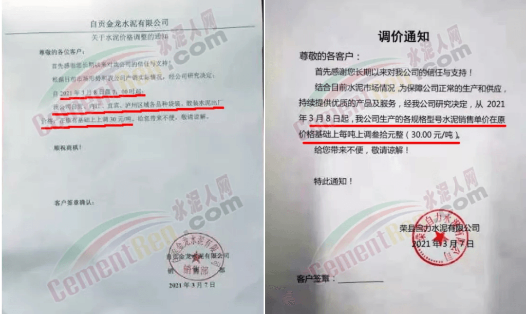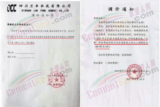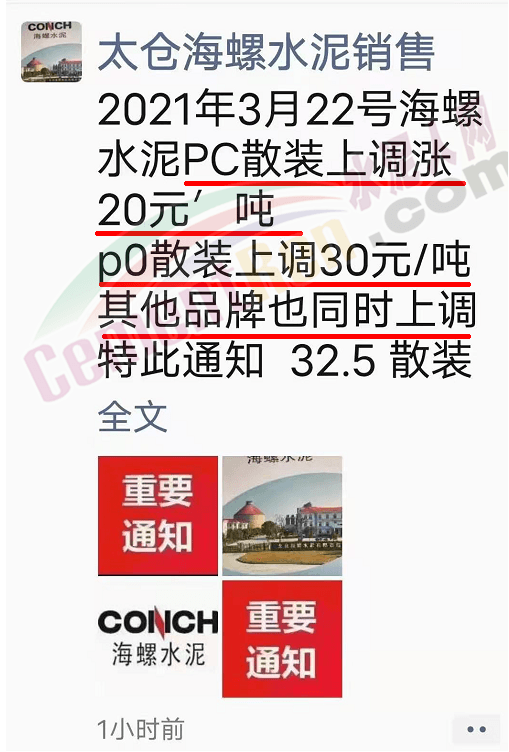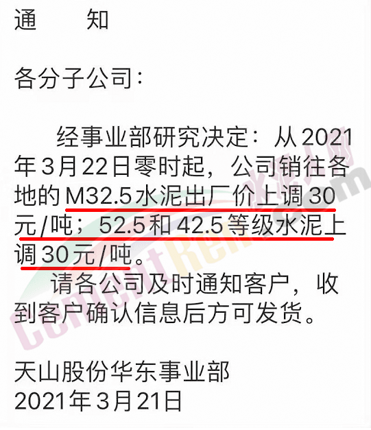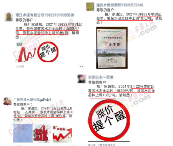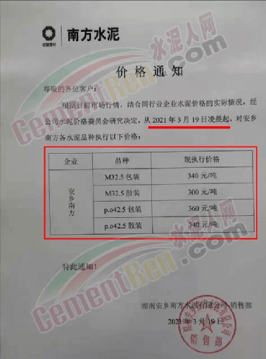 同時(shí),下游經(jīng)銷(xiāo)商也集體發(fā)通知告知客戶(hù)水泥漲價(jià)的消息。