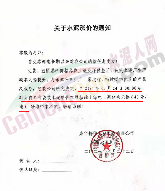 嘉華特種水泥股份有限公司通知自3月24日0時(shí)起上調(diào)所有品種袋裝水泥價(jià)格40元/噸。