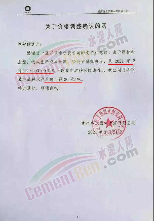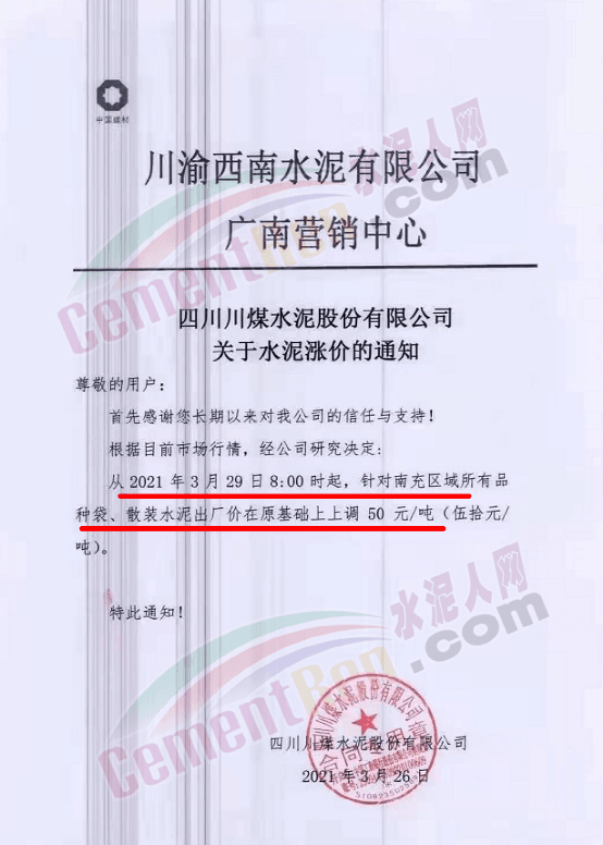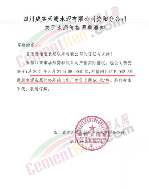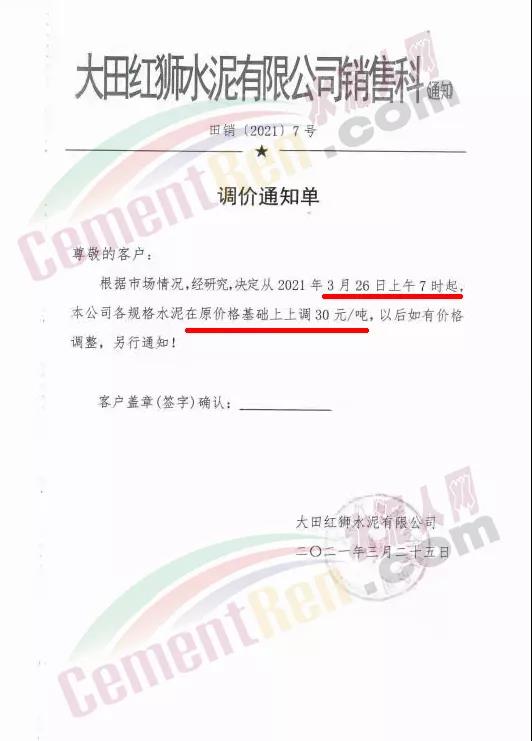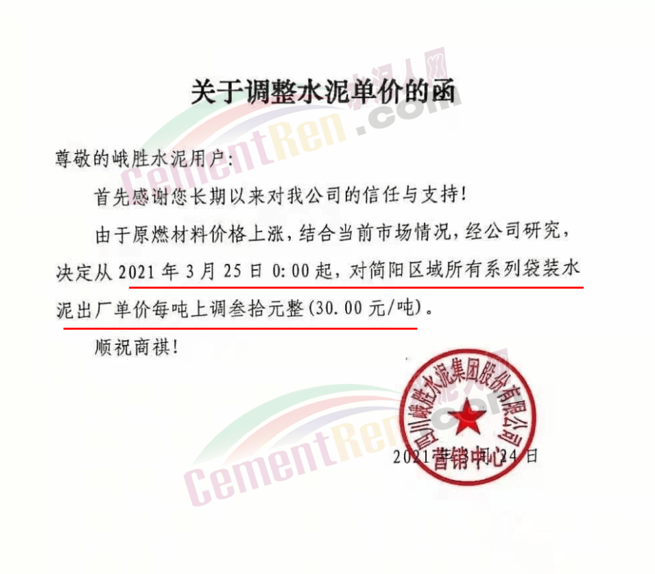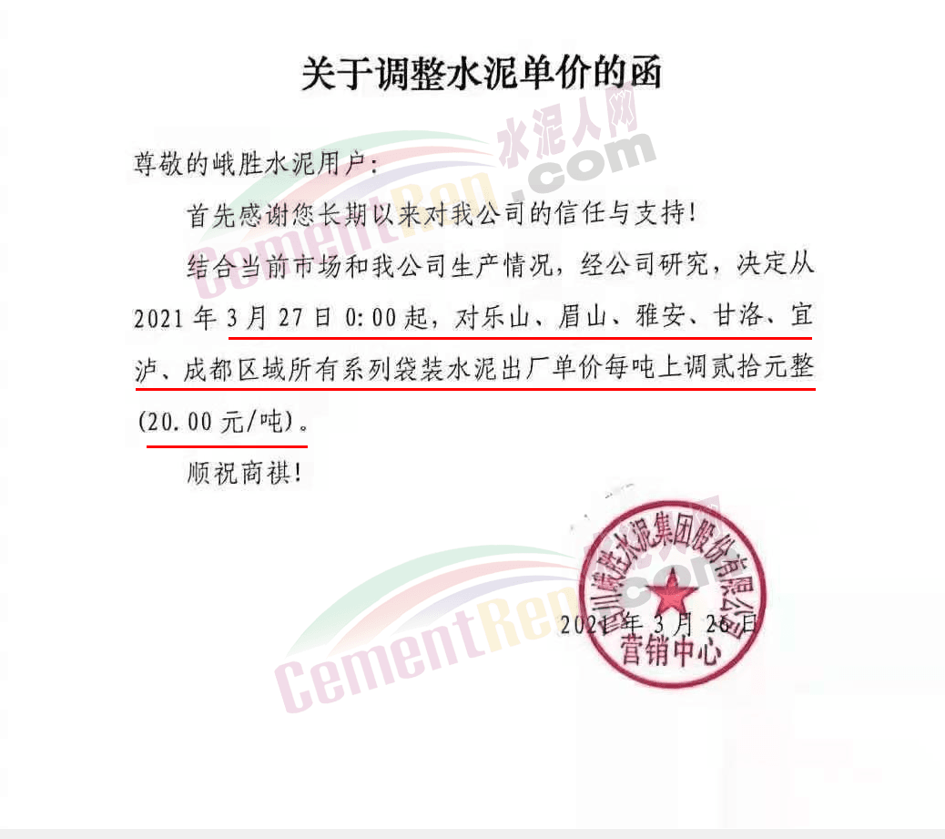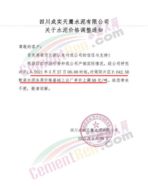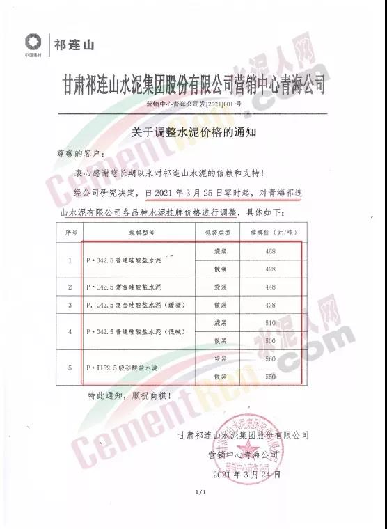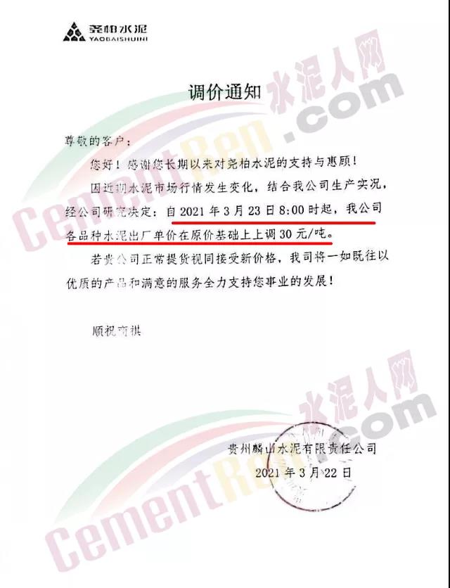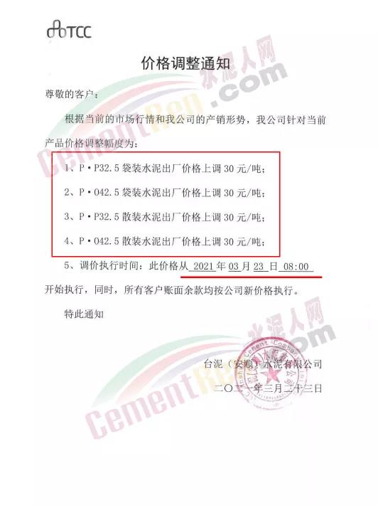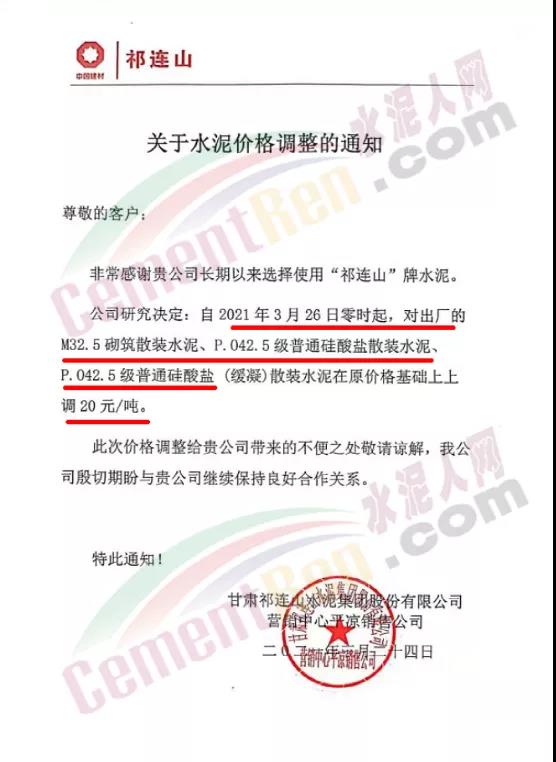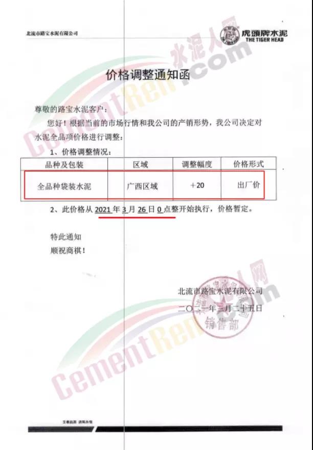 根據(jù)近期市場(chǎng)形勢(shì),我司決定于2021年3月25日00:00起,全品項(xiàng)袋裝和散裝水泥價(jià)格上調(diào)20元/噸。