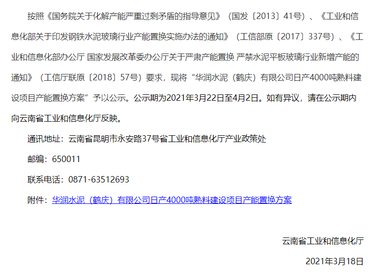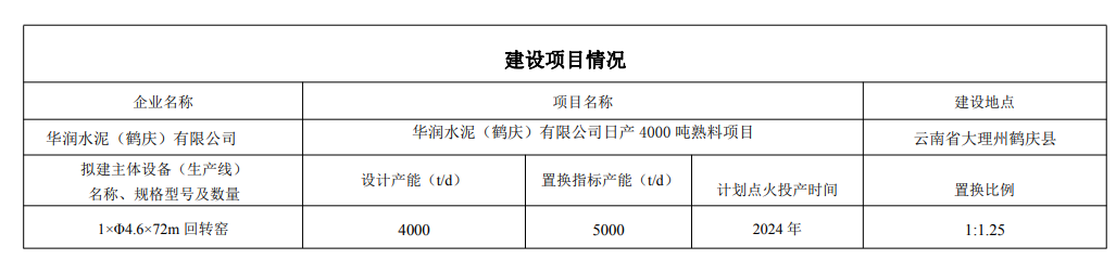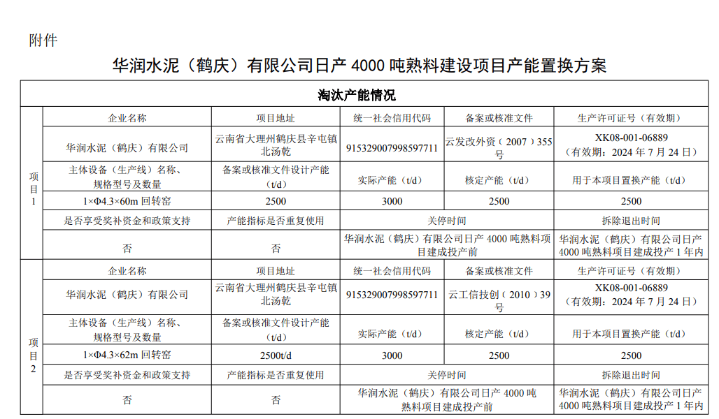 日前云南工信廳發(fā)布了一則水泥熟料生產(chǎn)線產(chǎn)能置換公示稱,華潤水泥鶴慶公司通過退出兩條2500t/d生產(chǎn)線,在云南省大理州鶴慶縣內(nèi)新建一條4000t/d熟料生產(chǎn)線,并計劃于2024年點火投產(chǎn),兩條2500t/d生產(chǎn)線將于新建項目建成投產(chǎn)1年內(nèi)拆除退出。
