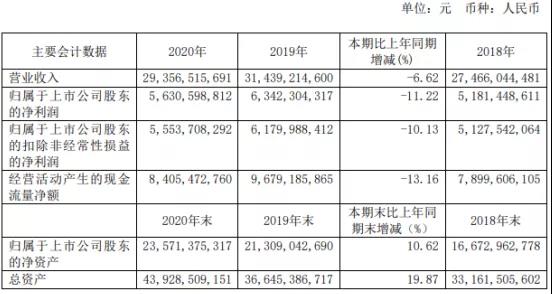 公告披露顯示經(jīng)董事會(huì)審議的報(bào)告期利潤分配預(yù)案或公積金轉(zhuǎn)增股本預(yù)案:2020年度,母公司實(shí)現(xiàn)凈利潤為3,155,313,737元,合并后歸屬于母公司股東的凈利潤為5,630,598,812元。截止2020年12月31日母公司可供分配利潤為7,370,600,800元。