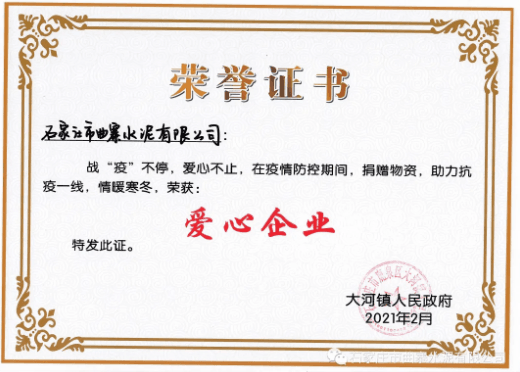 疫情無情,人間有愛,為弘揚正能量,充分發(fā)揮先進(jìn)典型作用,2021年3月25日,大河鎮(zhèn)人民政府舉辦2020年抗擊疫情表彰會。石家莊市曲寨水泥獲得“抗疫愛心企業(yè)”稱號。