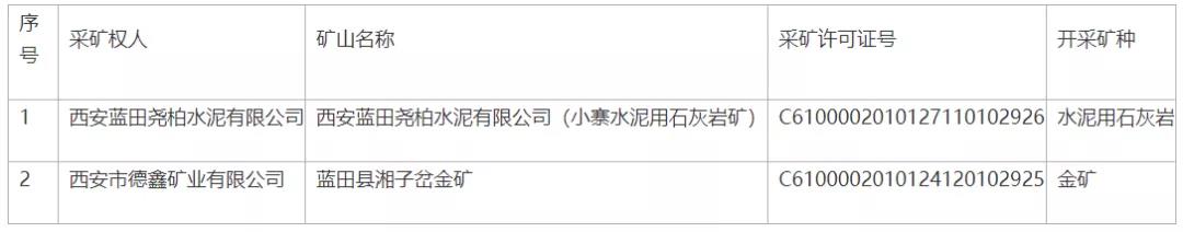 按照《陜西省秦嶺生態(tài)環(huán)境保護(hù)條例》《西安市秦嶺生態(tài)環(huán)境保護(hù)條例》有關(guān)規(guī)定,根據(jù)《自然資源部辦公廳關(guān)于政策性關(guān)閉礦山采礦許可證注銷有關(guān)工作的函》(自然資辦函〔2019〕1574號(hào)) 和《中共西安市委關(guān)于全面加強(qiáng)秦嶺生態(tài)環(huán)境保護(hù)工作的決定》(市發(fā)〔2019〕8號(hào))等文件要求,經(jīng)縣政府研究,決定對(duì)西安藍(lán)田堯柏水泥有限公司小寨水泥用石灰?guī)r礦、西安市德鑫礦業(yè)有限公司湘子岔金礦依法予以關(guān)閉?,F(xiàn)就關(guān)閉礦山信息通告如下: