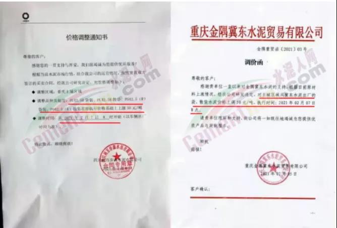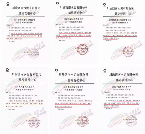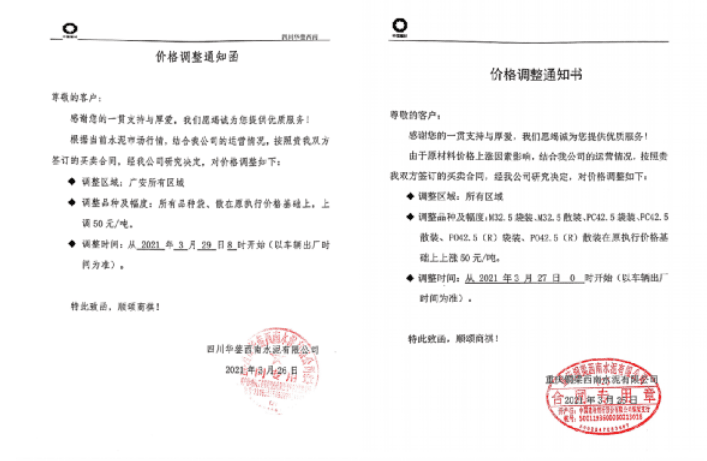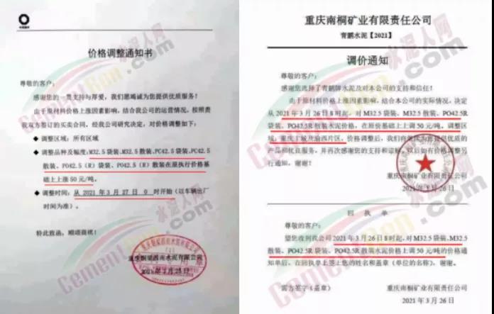 重慶市兩次調(diào)價,50多家水泥企業(yè)價格上調(diào)超100元/噸