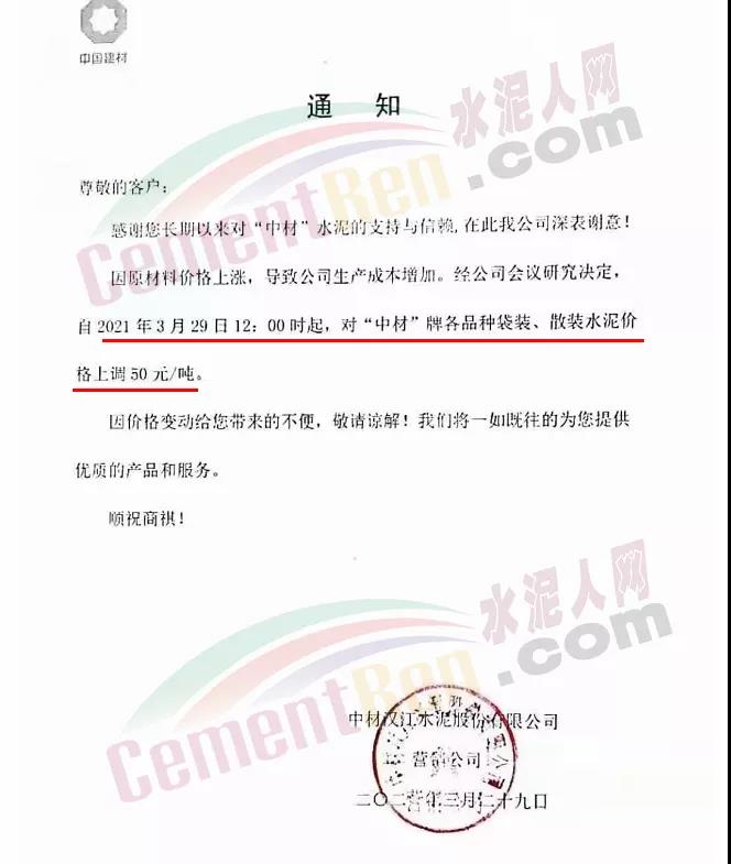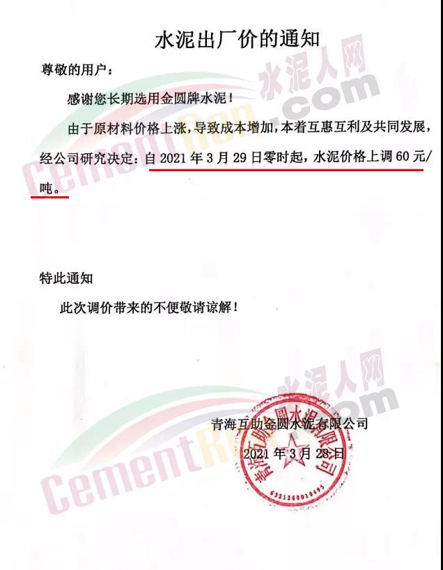 青?;ブ饒A水泥通知自3月29日起水泥價格上調(diào)60元/噸。