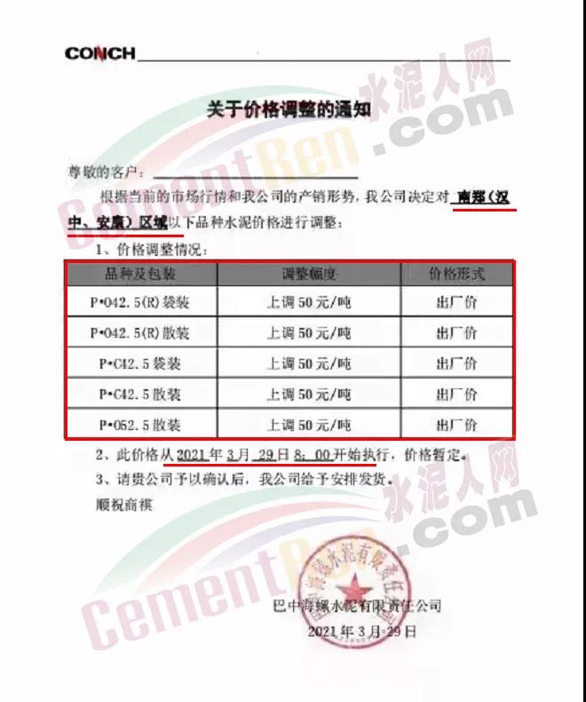 日前,巴中海螺水泥有限責(zé)任公司通知根據(jù)當(dāng)前市場行情和公司的產(chǎn)銷形勢,自3月29日起對南效(漢中、安康)區(qū)域P.O42.5(R)和P.O52.5等標(biāo)號包裝和散裝水泥出廠價上調(diào)50元/噸。
