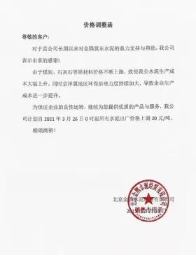 金隅冀東水泥(唐山)有限責(zé)任公司營銷分公司通知,由于企業(yè)環(huán)保投入、原材料成本不斷增加,致使水泥成本不斷提高。為保證企業(yè)正常運(yùn)營,對水泥的出廠價格進(jìn)行調(diào)整,3月25日起,天津地區(qū)各品種散裝水泥和袋裝水泥出廠價格在原價格基礎(chǔ)上上調(diào)20元/噸。