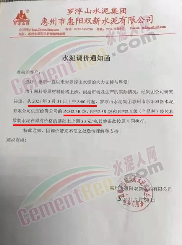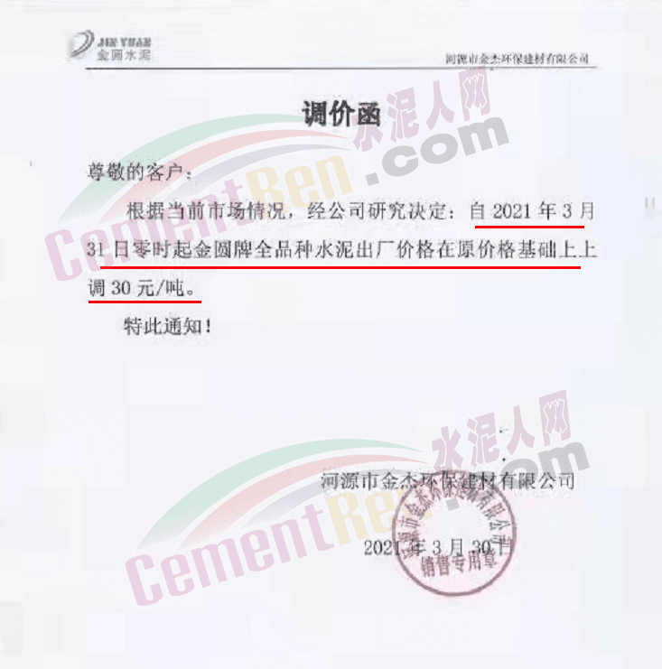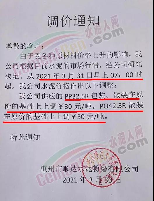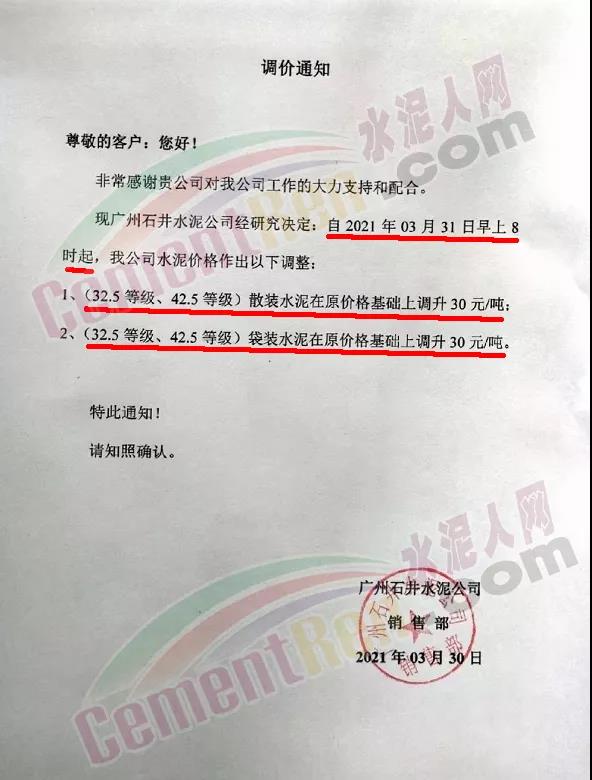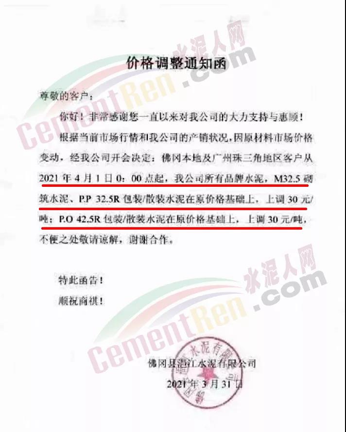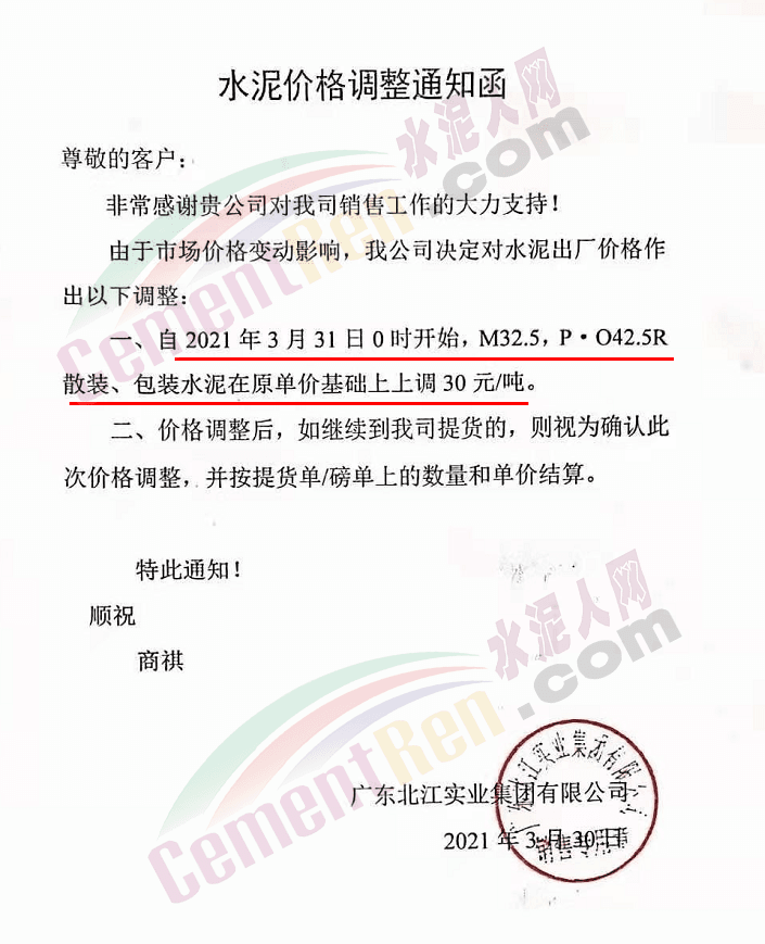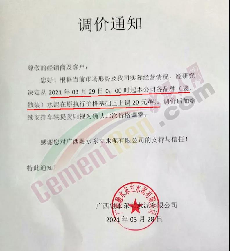 由于原燃材料大幅度上漲,經(jīng)我司研究決定,從2021年04月1日起,我司發(fā)往廣東省的各品牌、各品種規(guī)格袋裝、散裝水泥出廠單價(jià)在原價(jià)格基礎(chǔ)上每噸上調(diào)30元。熟料出廠單價(jià)在原價(jià)格基礎(chǔ)上每噸上調(diào)20元。不便之處,敬請(qǐng)見(jiàn)諒。