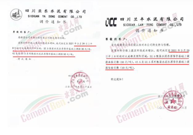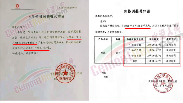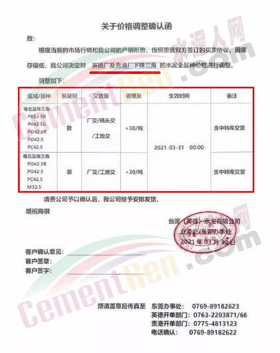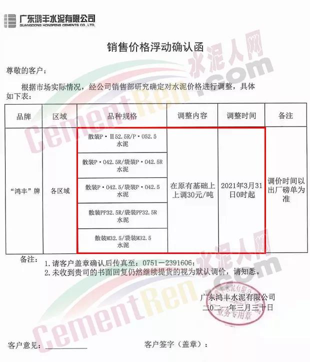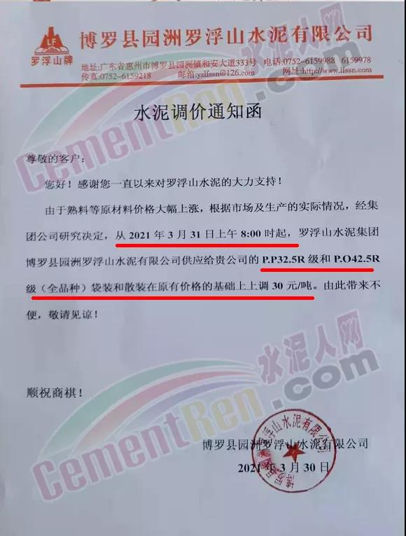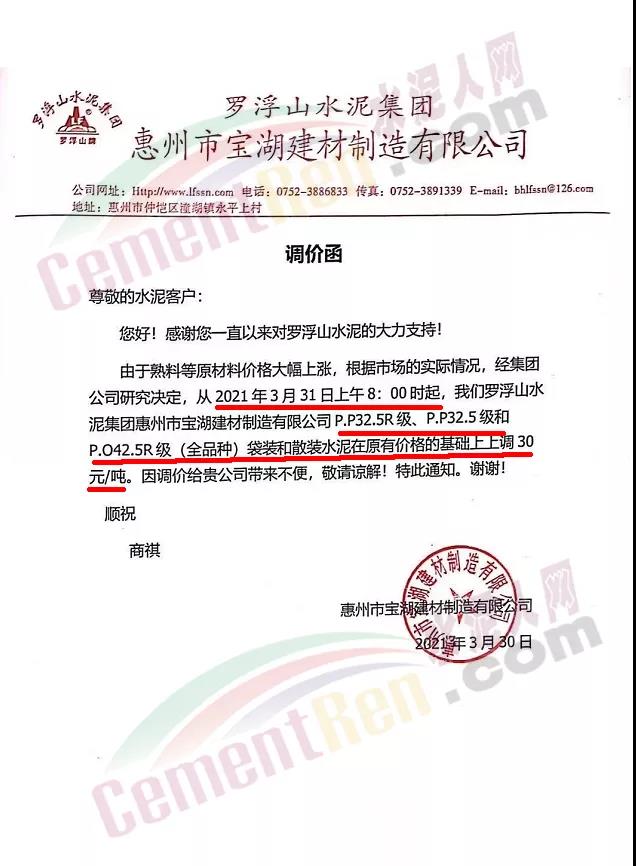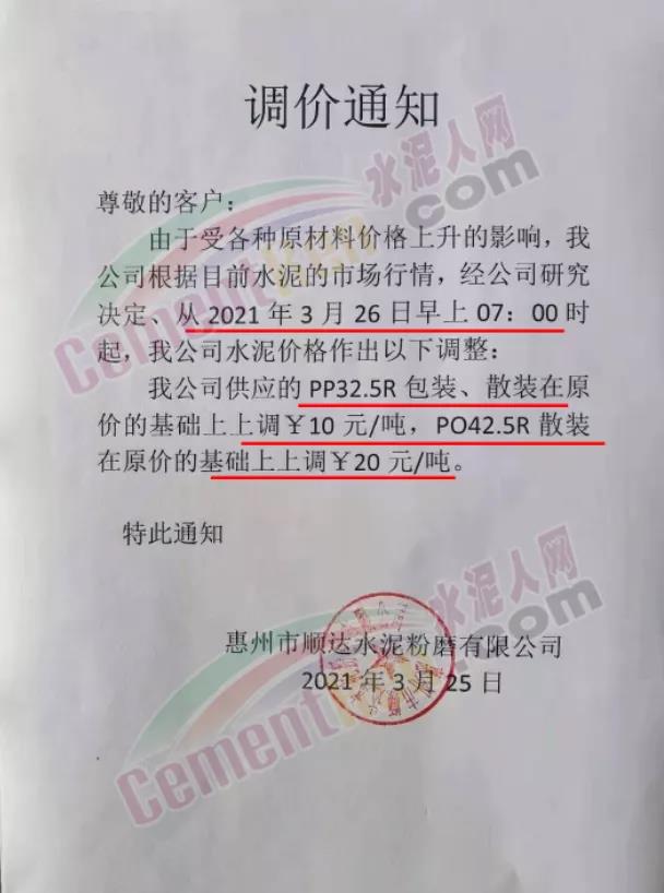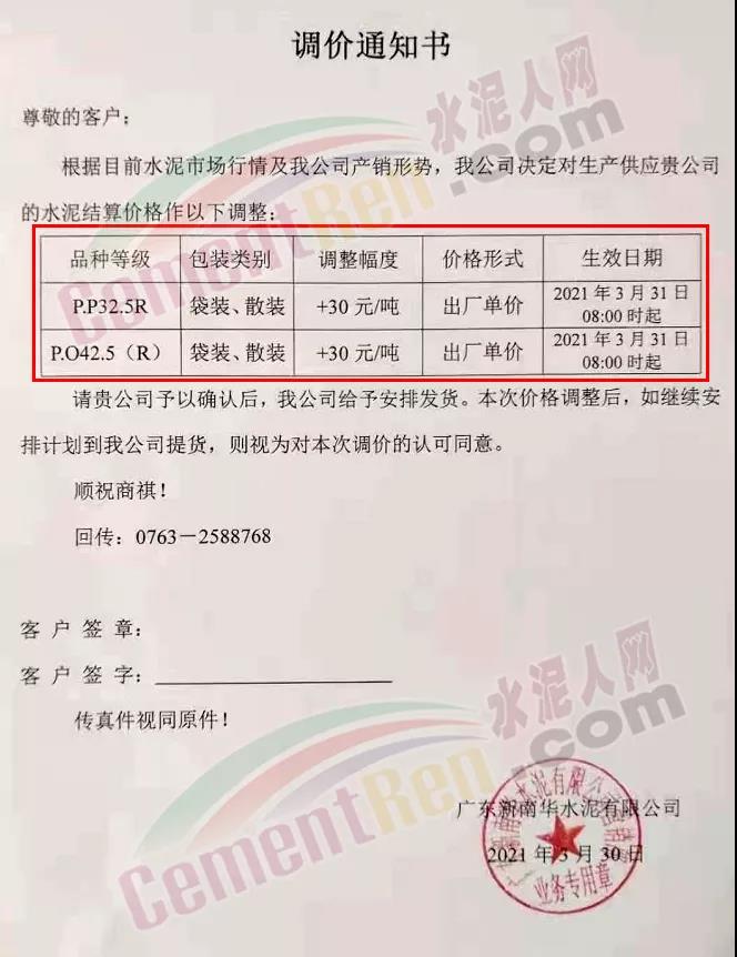 由于原燃材料大幅度上漲,經(jīng)我司研究決定,從2021年04月1日起,我司發(fā)往廣東省的各品牌、各品種規(guī)格袋裝、散裝水泥出廠單價(jià)在原價(jià)格基礎(chǔ)上每噸上調(diào)30元。熟料出廠單價(jià)在原價(jià)格基礎(chǔ)上每噸上調(diào)20元。不便之處,敬請(qǐng)見(jiàn)諒。