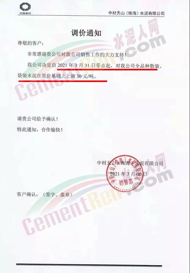 中材天山珠海水泥、中材亨達(dá)水泥通知自3月31日零點(diǎn)起,公司全品種散裝、袋裝水泥在原價(jià)基礎(chǔ)上上調(diào)30元/噸。