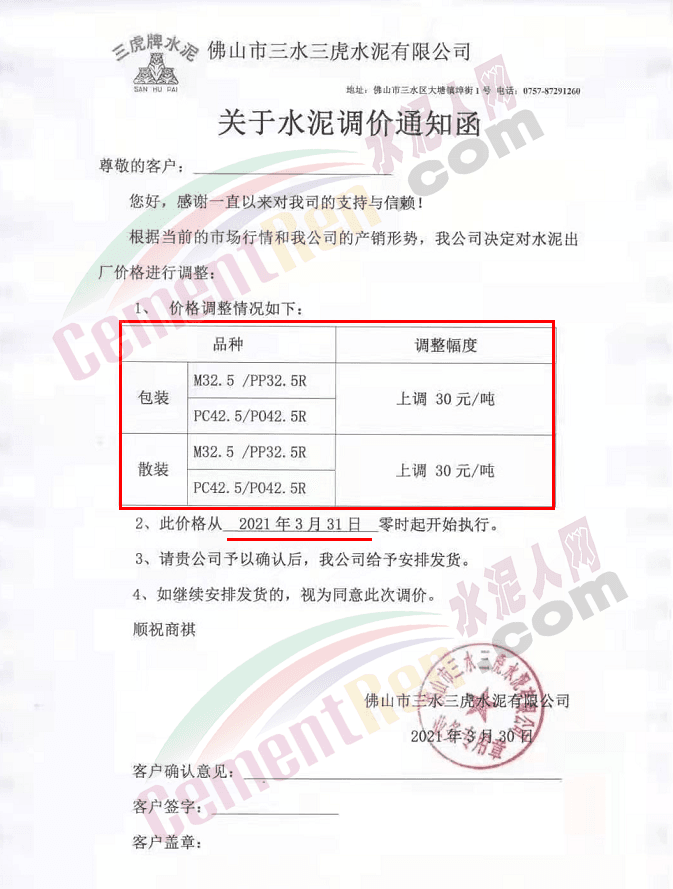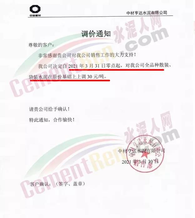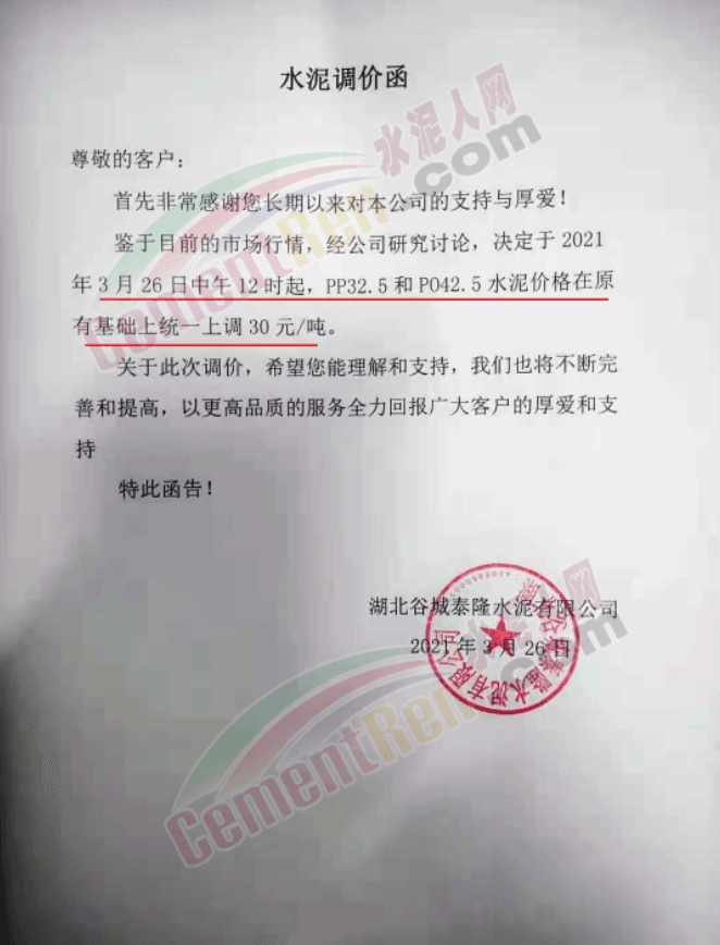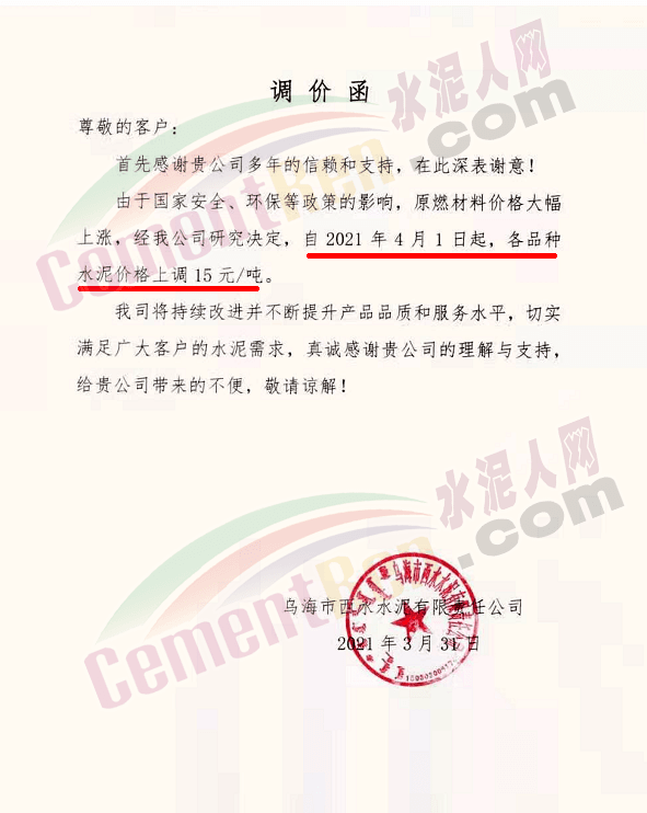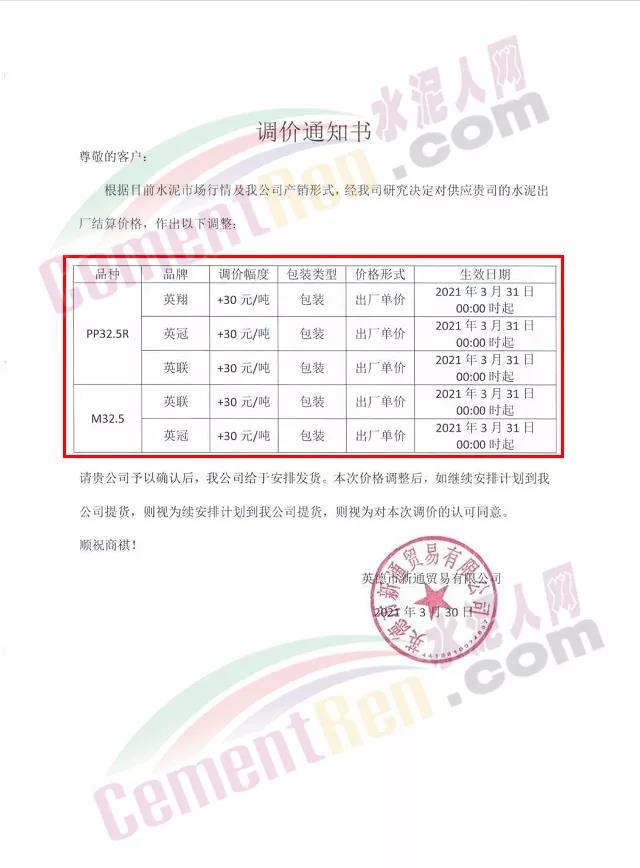 感謝您長(zhǎng)期以來(lái)對(duì)我公司產(chǎn)品的信任和支持。因生產(chǎn)成本增加,庫(kù)存緊張,經(jīng)我公司研究決定:為了確保持續(xù)向客戶保質(zhì)保量提供優(yōu)質(zhì)產(chǎn)品,自2021年3月31日早8點(diǎn)開始對(duì)我公司產(chǎn)品價(jià)格做出如下調(diào)整:P.O42.5等級(jí)水泥產(chǎn)品在原價(jià)基礎(chǔ)上上調(diào)30元/噸。我公司將以微信或短信形式發(fā)送調(diào)價(jià)通知,如貴公司繼續(xù)提貨則視為同意接受新價(jià)格。