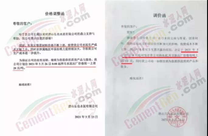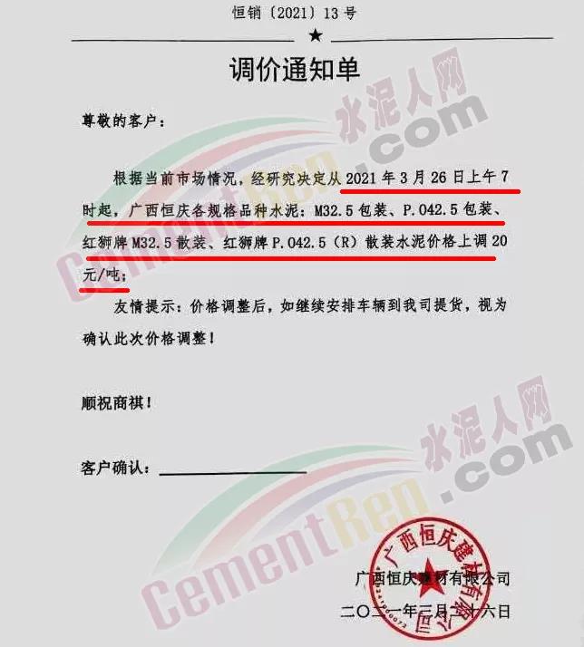 依據(jù)周邊市場(chǎng)價(jià)格,結(jié)合我公司實(shí)際情況,決定自2021年3月31日上午8:00開始,我公司2號(hào)線、3號(hào)線熟料價(jià)格上調(diào)20元/噸。