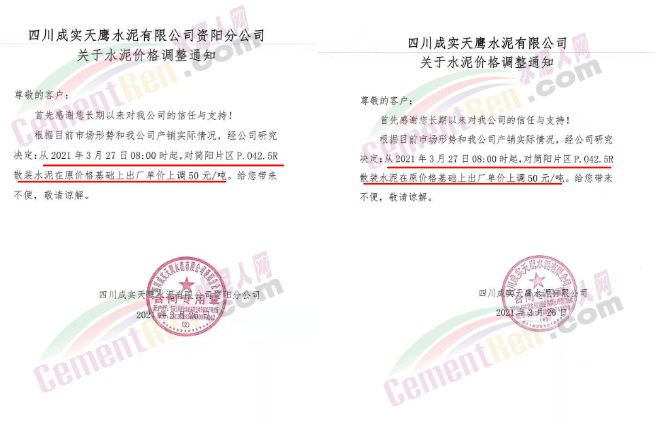 根據(jù)當(dāng)前市場(chǎng)行情,我公司于2021年3月26日8:00時(shí),對(duì)M32.5級(jí)袋裝水泥上調(diào)20元/噸,對(duì)PO42.5級(jí)袋裝水泥價(jià)格上調(diào)30元/噸,特此通知!