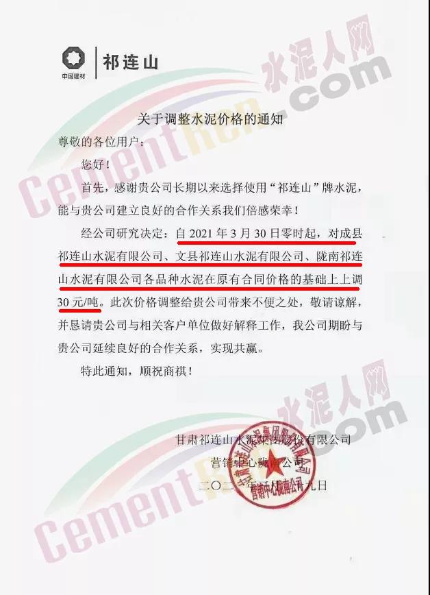 甘肅祁連山水泥集團(tuán)有限公司營(yíng)銷中心隴南公司通知,自3月30日零時(shí)起,對(duì)成縣祁連山水泥、文縣祁連山水泥、隴南祁連山水泥各品種水泥在原合同價(jià)格的基礎(chǔ)上調(diào)30元/噸。