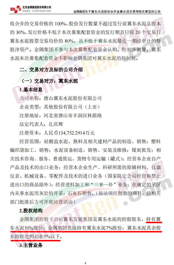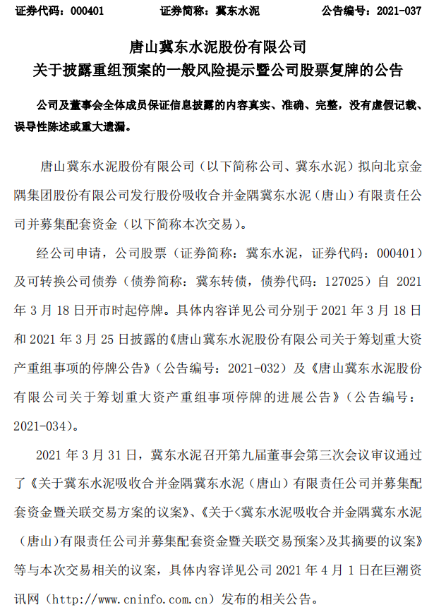 3月31日晚間,冀東水泥(000401)發(fā)布公告稱,公司擬向金隅集團發(fā)行股份吸收合并金隅冀東水泥(唐山)有限責任公司(以下簡稱“金隅冀東水泥”)47.09%股權(quán)并募集配套資金,標的資產(chǎn)預估值約為136.33億元,公司股票及可轉(zhuǎn)債將于4月1日起復牌。