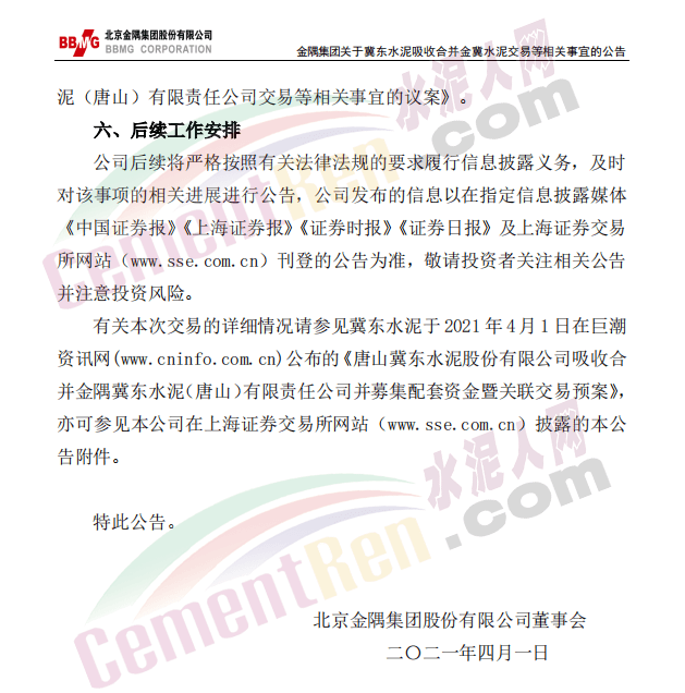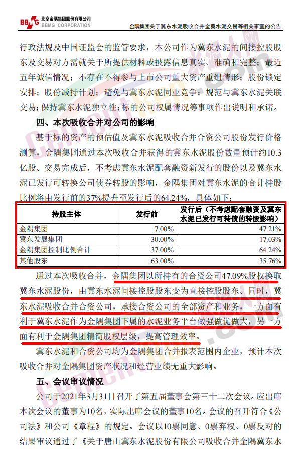 3月31日晚間,上市公司北京金隅集團股份有限公司發(fā)布《關(guān)于唐山冀東水泥股份有限公司吸收合并金隅冀東水泥(唐山)有限責任公司交易等相關(guān)事宜的公告》稱:2021年3月31日,北京金隅集團股份有限公司第五屆董事會第三十二次會議審議通過了《關(guān)于唐山冀東水泥股份有限公司吸收合并金隅冀東水泥(唐山)有限責任公司交易等相關(guān)事宜的議案》,同意公司以所持金隅冀東水泥(唐山)有限責任公司47.09%的股權(quán)認購唐山冀東水泥股份有限公司新發(fā)行的股份,由冀東水泥吸收合并合資公司。同日,公司與冀東水泥、合資公司簽訂附生效條件的《吸收合并協(xié)議》。