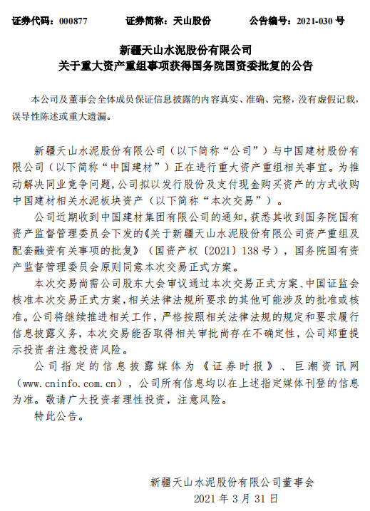 公司近期收到中國建材的通知,獲悉其收到國務(wù)院國資委下發(fā)的《關(guān)于新疆天山水泥股份有限公司資產(chǎn)重組及配套融資有關(guān)事項的批復(fù)》,國務(wù)院國資委原則同意本次交易正式方案。