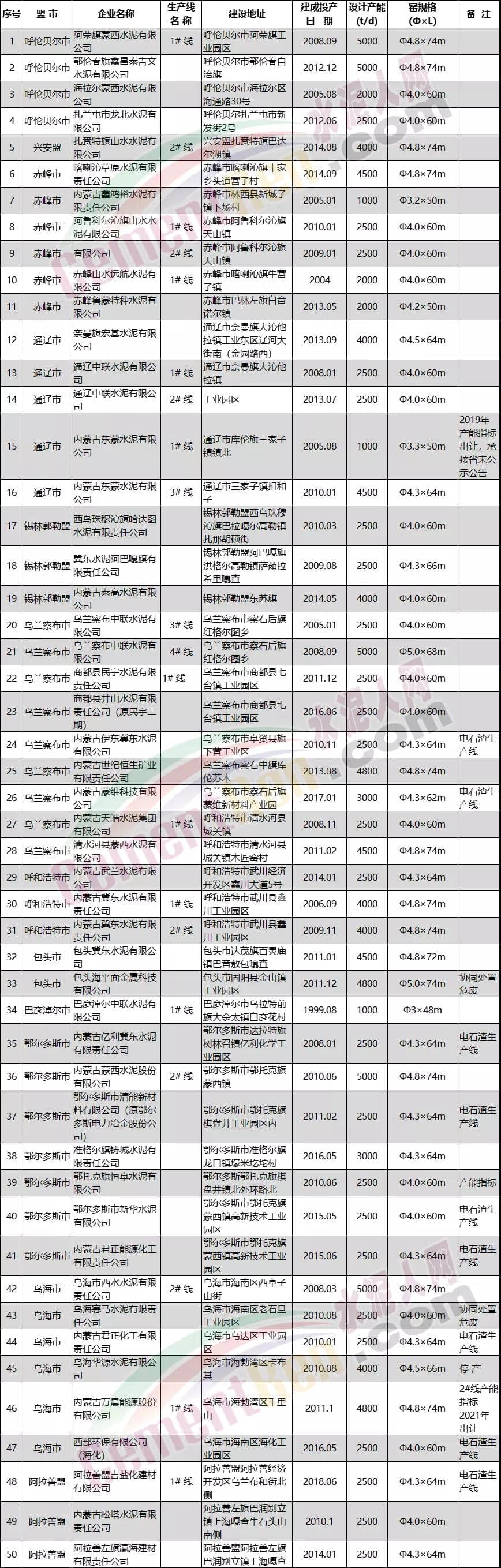 內(nèi)蒙古自治區(qū)水泥熟料生產(chǎn)線清單