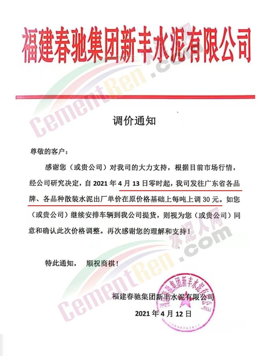 福建春馳集團新豐水泥有限公司通知自4月13日零時起,發(fā)往廣東省各品牌、各品種散裝水泥出廠單價在原價格基礎上上調30元/噸。