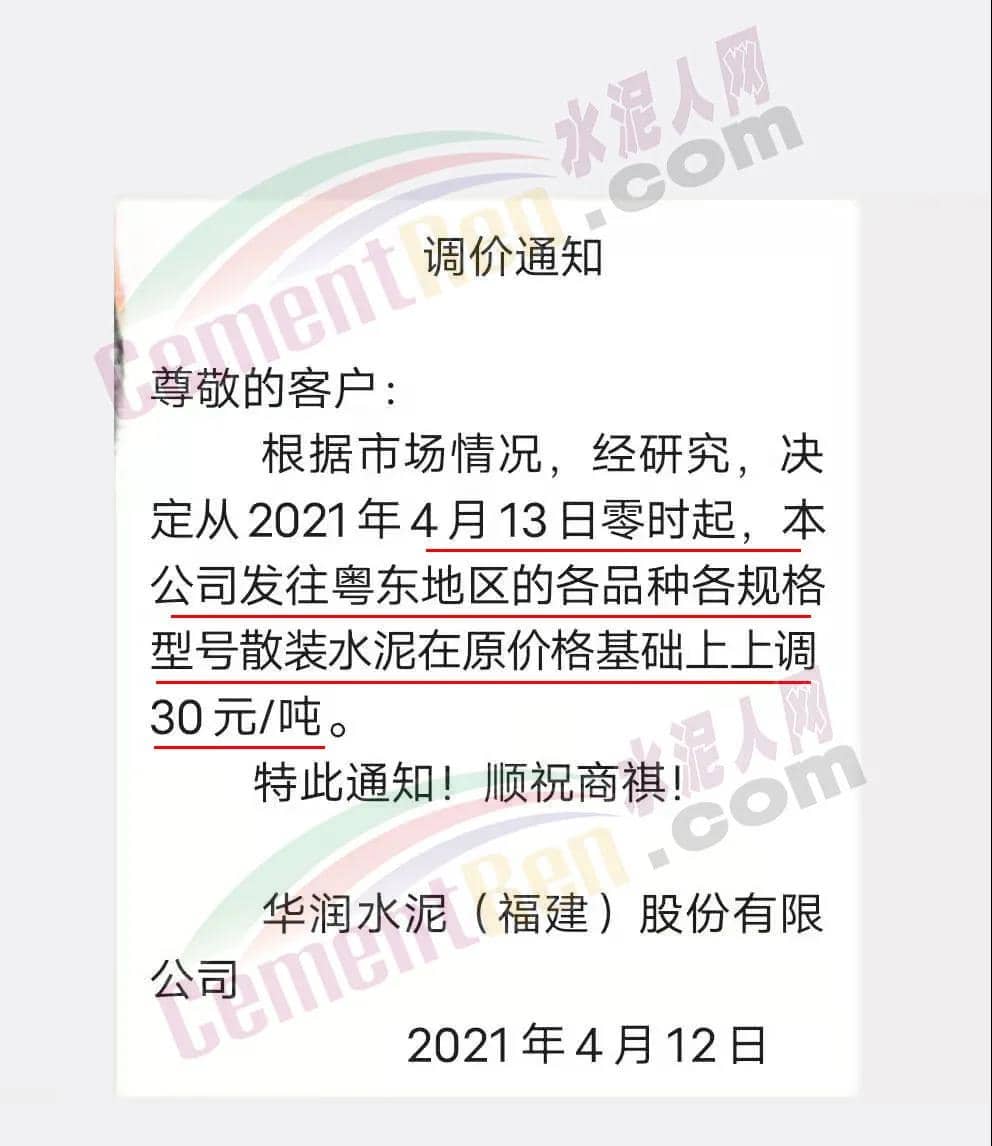 華潤水泥(福建)股份有限公司通知從4月13日零時起,公司發(fā)往粵東地區(qū)的各品種各規(guī)格型號散裝水泥在原價格基礎上上調30元/噸。