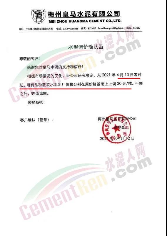 梅州皇馬水泥有限公司從4月13日零時起,所有品種散裝水泥出廠價格分別在原價格基礎上上調30元/噸。