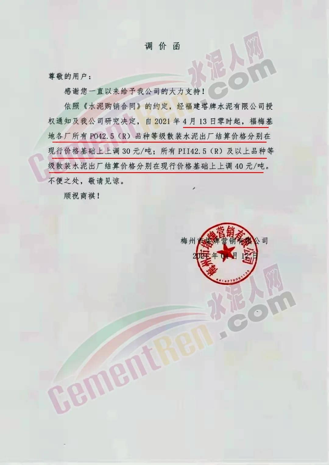 梅州市塔牌營銷有限公司通知,經(jīng)福建塔牌水泥有限公司授權通知及公司研究決定,自4月13日零時起,福梅基地各廠所有PO42.5(R)品種等級散裝水泥出廠結算價格分別在現(xiàn)行價格基礎上上調30元/噸;所有 PII42.5(R)及以上品種等級散裝水泥出廠結算價格分別在現(xiàn)行價格基礎上上調40元/噸。