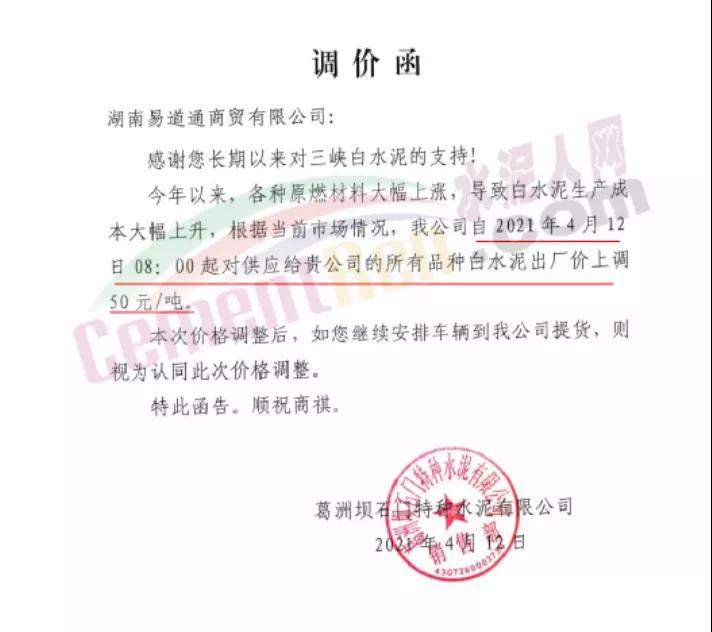 武漢市春森特種水泥有限公司通知,鑒于白水泥生產(chǎn)使用的原(燃)材料價格大幅度上漲等因素。經(jīng)公司研究決定,自4月12日8時起,公司生產(chǎn)的各種規(guī)格型號的白水泥在原價格的基礎上,均上調50元/噸。