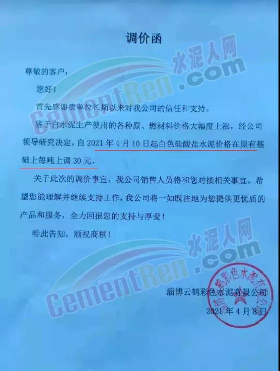 新鄉(xiāng)市黃河白水泥有限責任公司通知,鑒于白水泥生產(chǎn)使用的原(燃)材料價格大幅度上漲等因素,經(jīng)公司研究決定,自4月12日12時起,公司生產(chǎn)的各種規(guī)格型號時白水泥在原價格的基礎上,均上調40元/噸。