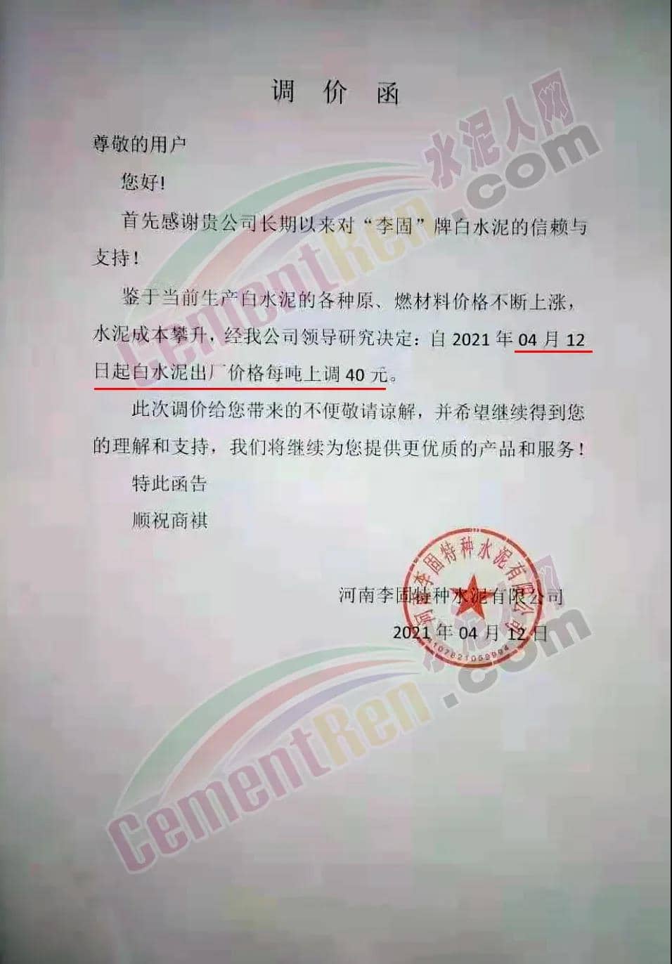 河南李固特種水泥有限公司通知,鑒于當前生產(chǎn)白水泥的各種原、燃材料價格不斷上漲,水泥成本攀升,經(jīng)公司領導研究決定,自2021年4月12日起白水泥出廠價格上調40元/噸。