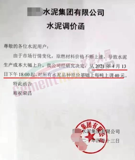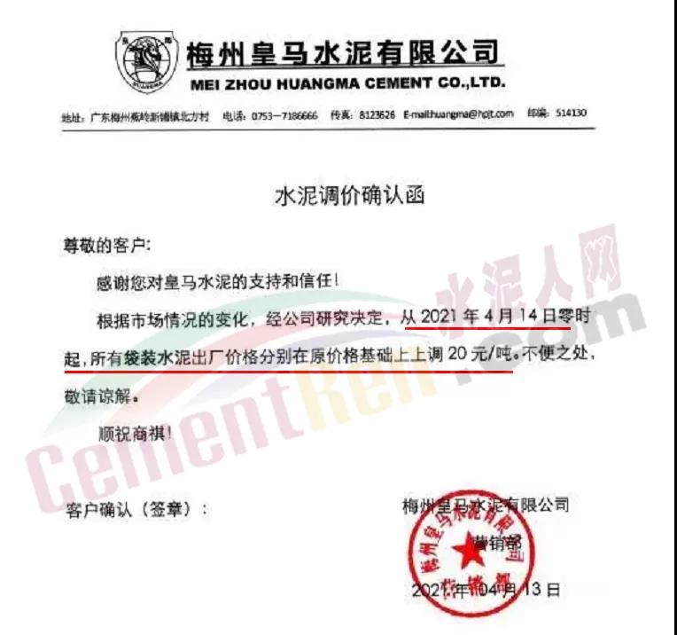 梅州皇馬水泥有限公司通知,自4月14日零時(shí)起,所有袋裝水泥出廠價(jià)格分別在原價(jià)基礎(chǔ)上上調(diào)20元/噸。