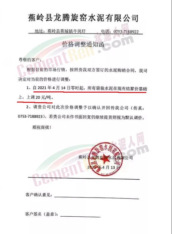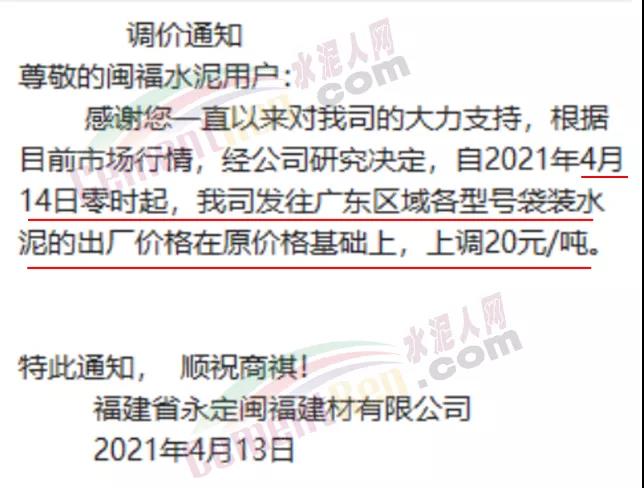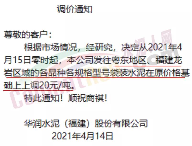 華潤(rùn)水泥(福建)股份有限公司通知自4月15日零時(shí)起,公司發(fā)往粵東地區(qū)、福建龍巖區(qū)域的各品種各規(guī)格型號(hào)袋裝水泥在原價(jià)基礎(chǔ)上上調(diào)20元/噸。