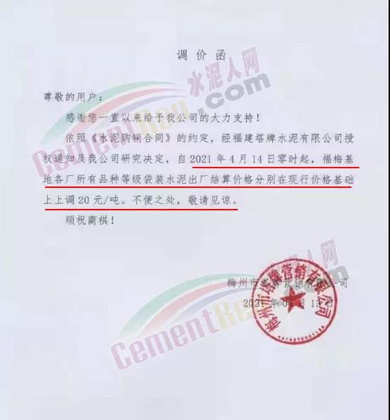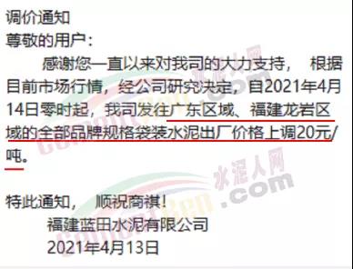 福建藍(lán)田水泥通知從4月14日零時(shí)起,發(fā)往廣東區(qū)域、福建龍巖區(qū)域的全部品牌規(guī)格袋裝水泥出廠價(jià)格上調(diào)20元/噸。