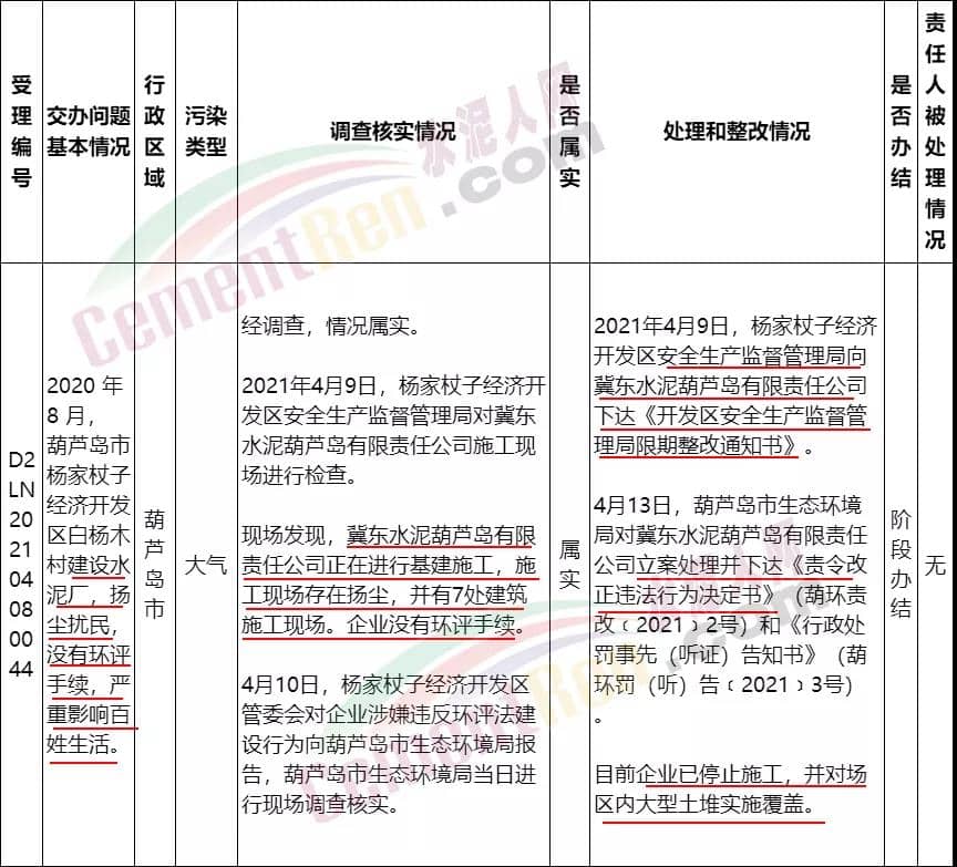 日前,遼寧省生態(tài)環(huán)境廳公布《中央第二生態(tài)環(huán)境保護(hù)督察組群眾信訪舉報(bào)轉(zhuǎn)辦和邊督邊改公開情況一覽表(第3批 2021年4月18日)》提到一起階段性辦結(jié)信訪,涉及冀東水泥葫蘆島有限責(zé)任公司。