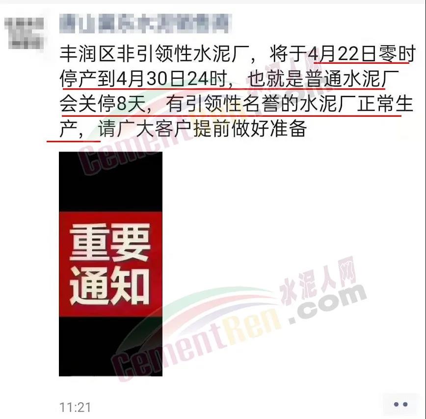 水泥人網(wǎng)通訊員消息:日前,河北唐山豐潤區(qū)水泥經(jīng)銷商通知,“豐潤區(qū)非引領(lǐng)性水泥廠,將于4月22日零時停產(chǎn)到4月30日24時,也就是普通水泥廠會關(guān)停8天,有引領(lǐng)性名譽(yù)的水泥廠正常生產(chǎn)”。同時,區(qū)域內(nèi)部分企業(yè)已經(jīng)率先通知上調(diào)水泥價格。