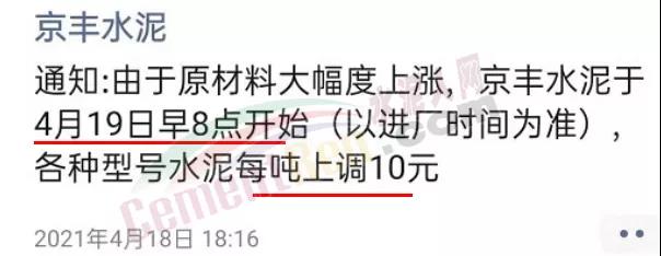 京豐水泥通知由于原材料大幅度上漲,京豐水泥于4月19日早8時上調(diào)各型號水泥價格10元/噸。
