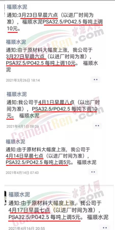 福順?biāo)嗤ㄖ?由于原材料大幅度上漲,公司于4月17日早七點(diǎn),PSA32.5/PO42.5上調(diào)5元/噸。據(jù)水泥人網(wǎng)了解,自3月下旬開始福順?biāo)嘁讯啻紊险{(diào)水泥價格,累計(jì)上調(diào)40元/噸。