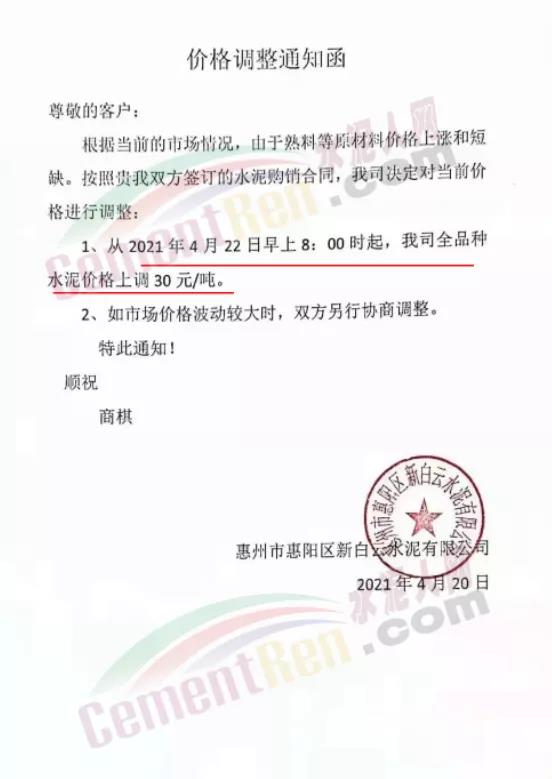 近期珠三角區(qū)域再次迎來全品種水泥價格上調(diào)30元/噸,惠州市惠陽區(qū)新白云水泥有限公司通知根據(jù)當(dāng)前的市場情況,由于熟料等原材料價格上漲和短缺。公司決定從4月22日早上8時起,全品種水泥價格上調(diào)30元/噸。